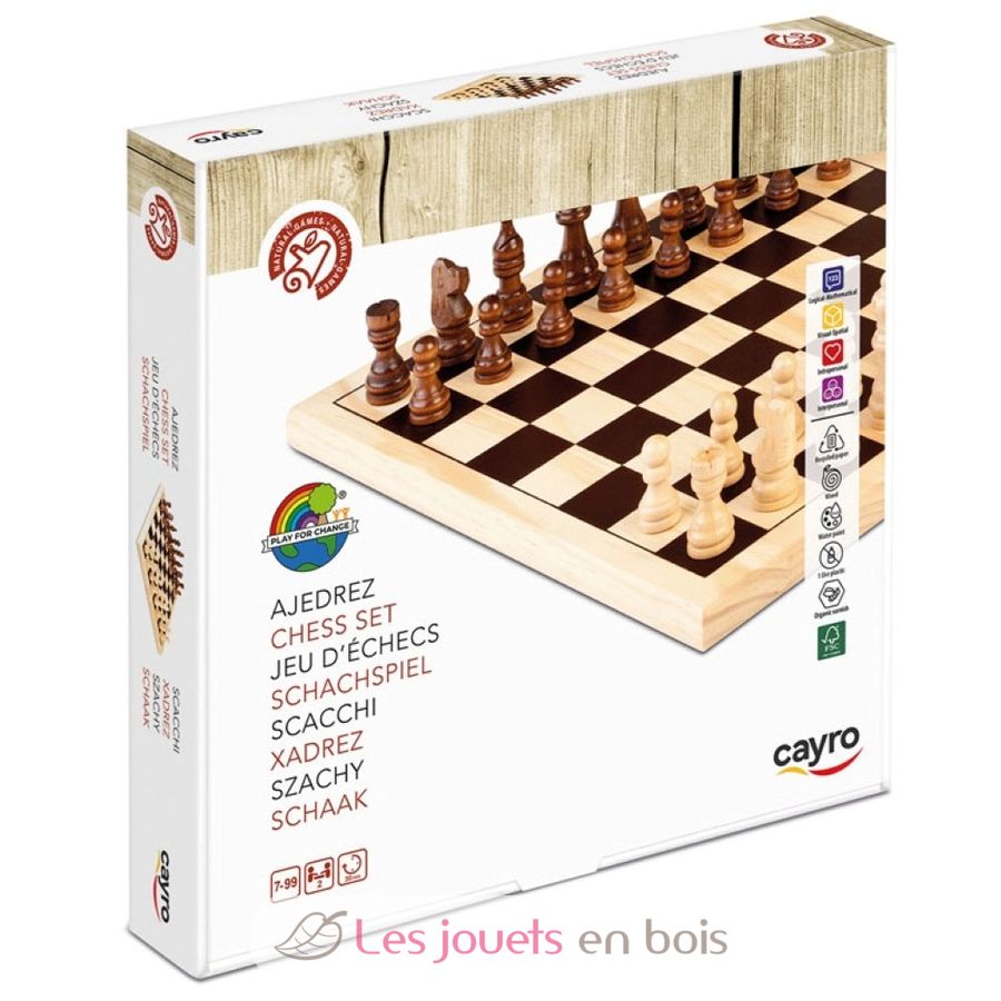 Juego de ajedrez de la marca Cayro, fabricado en madera con las casillas pintadas y luego barnizadas en mate. Este tablero de ajedrez contiene un juego de piezas de ajedrez de madera. La tabla de madera mide 30 x 30 x 5 cm.