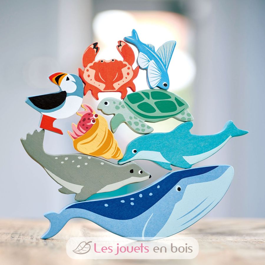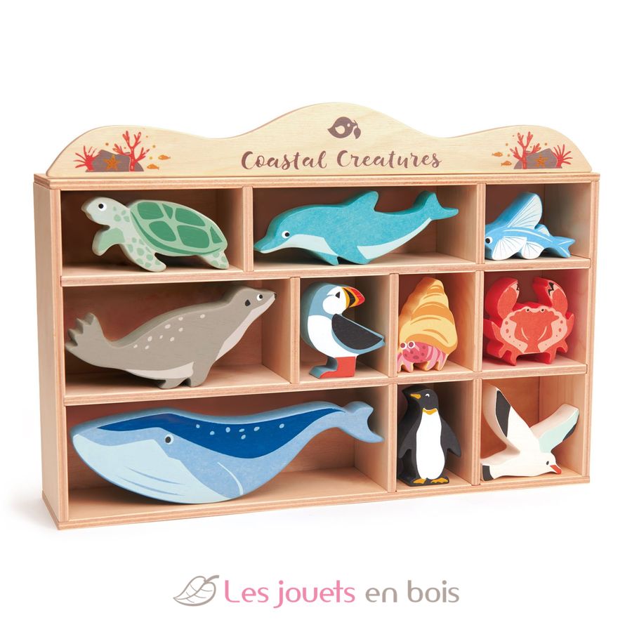 Este set de animales marinos de madera es ideal para introducir a tu hijo pequeño en los diferentes animales marinos. Incluye: una estantería de madera, 1 tortuga marina, 1 delfín, 1 pez volador, 1 foca, 1 frailecillo, 1 cangrejo, 1 cangrejo ermitaño, 1 ballena, 1 pingüino, y 1 gaviota.