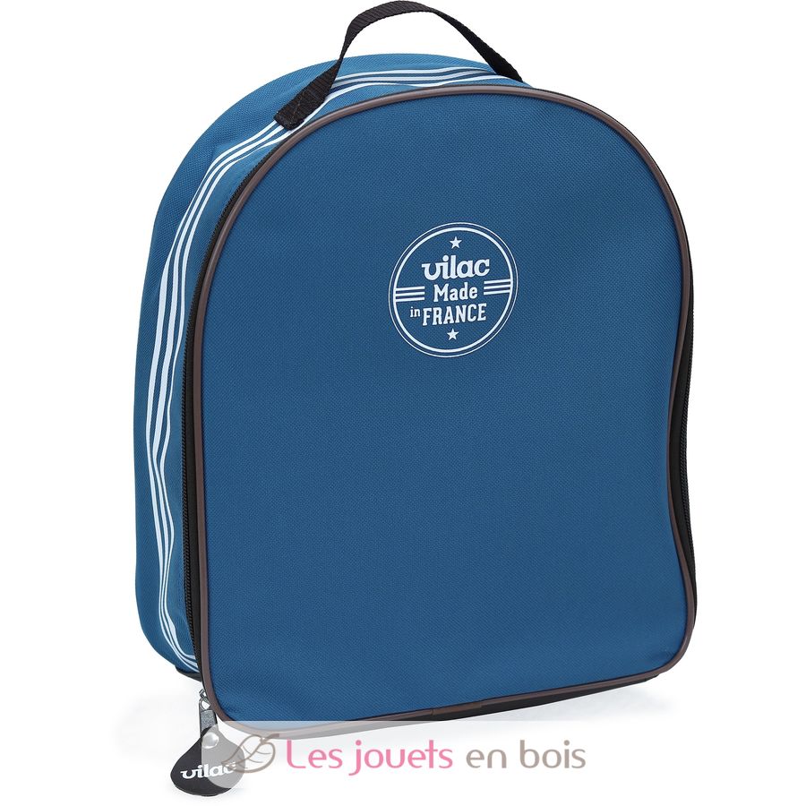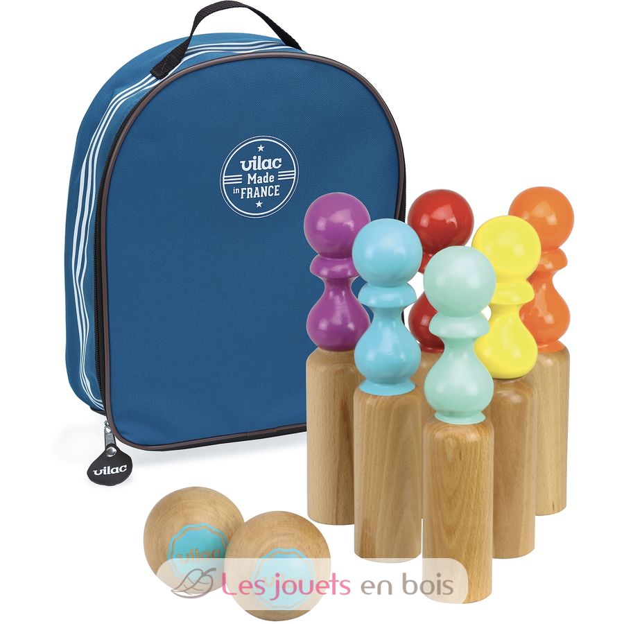 Juego de bolos Retro, un juego de bolos de madera maciza con barniz transparente y lacado de color. ¡Este juego de bolos viene con una bolsa para guardar los 6 bolos y las 2 bolas y te lo puedas llevar a todas partes! Les bolos miden 24 cm de alto y 4,5 cm de diámetro. Un juego de bolos de madera fabricado en Francia por la marca Vilac. Referencia 4063B.