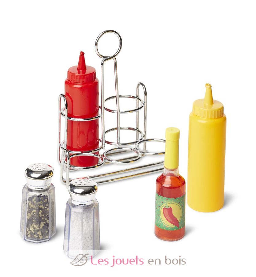 ¡Un imprescindible para equipar cocinas y otros comedores! ¡Condimentos más reales que la vida! Soporte metálico para mantener cada pieza en su sitio. El set de condimentos incluye ketchup, mostaza, sal, pimienta y salsa picante. Estas piezas de juego están diseñadas para durar innumerables aventuras culinarias.