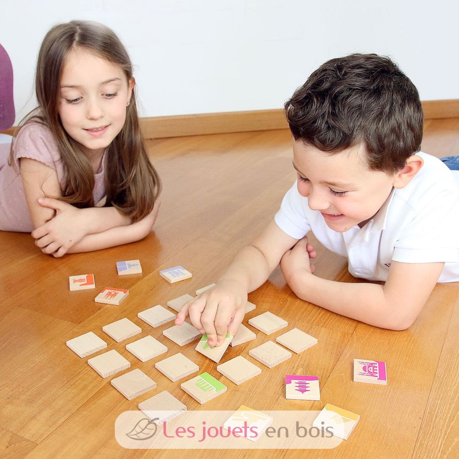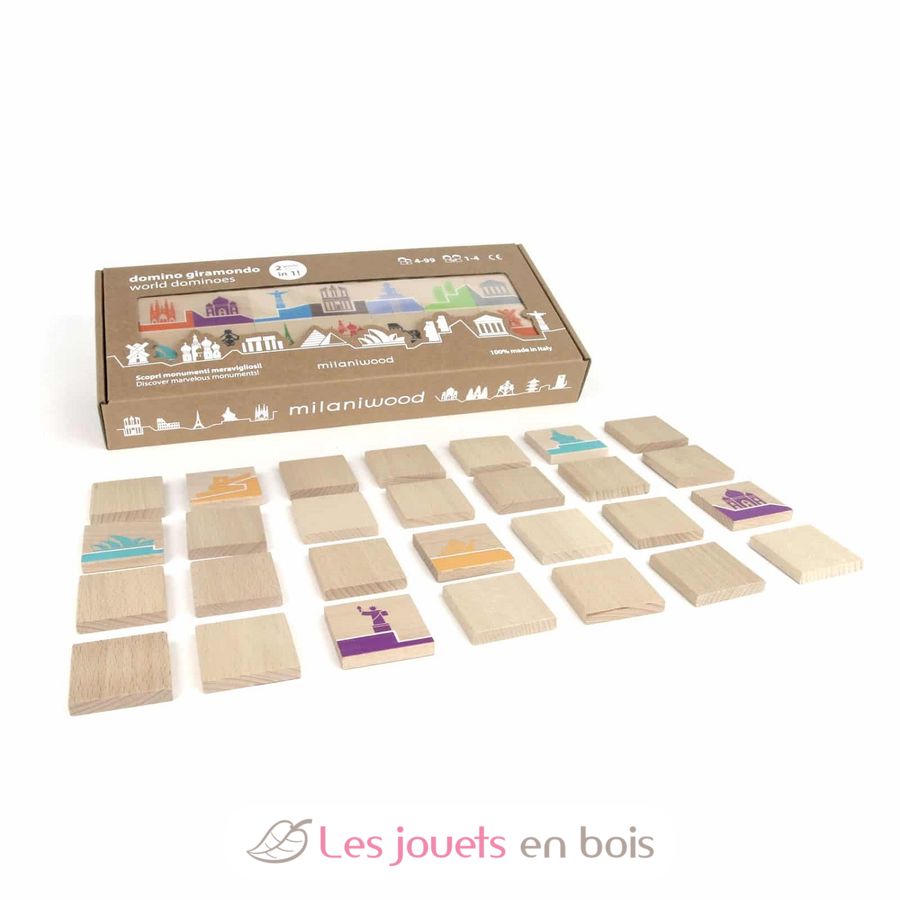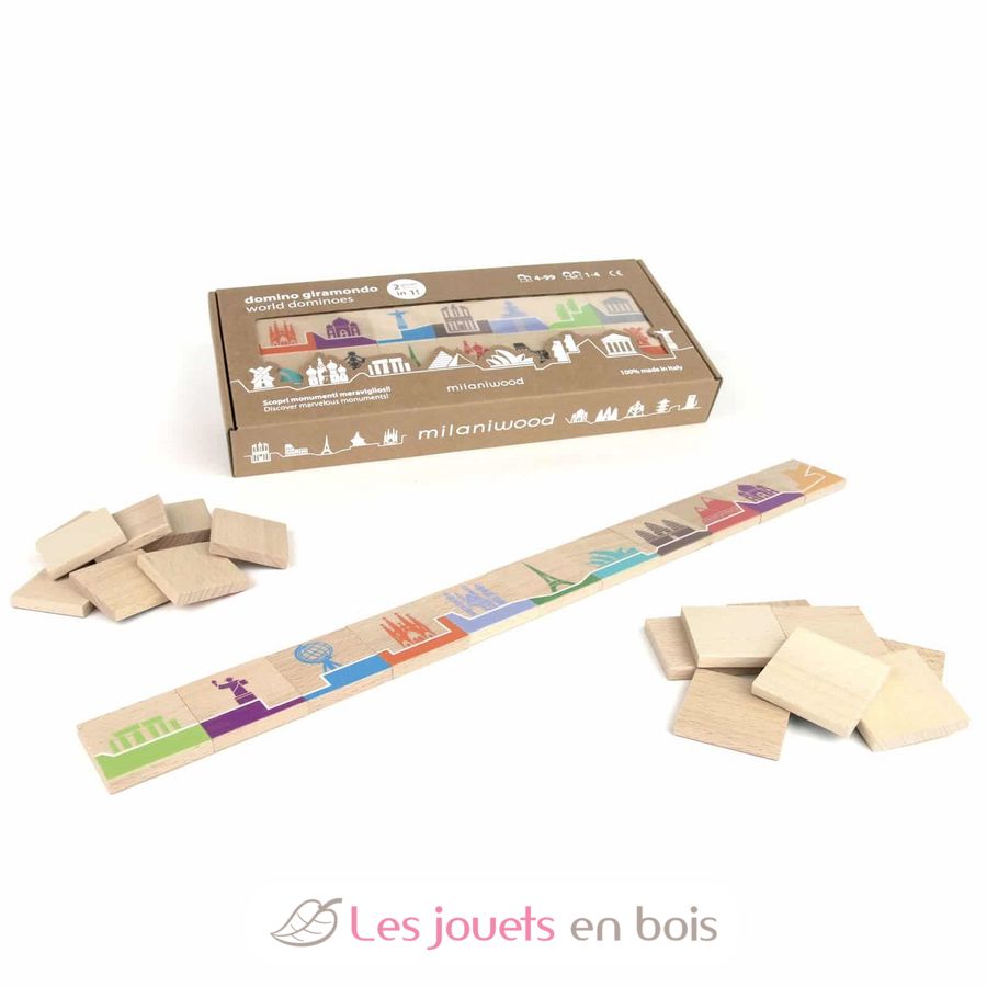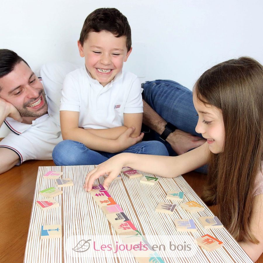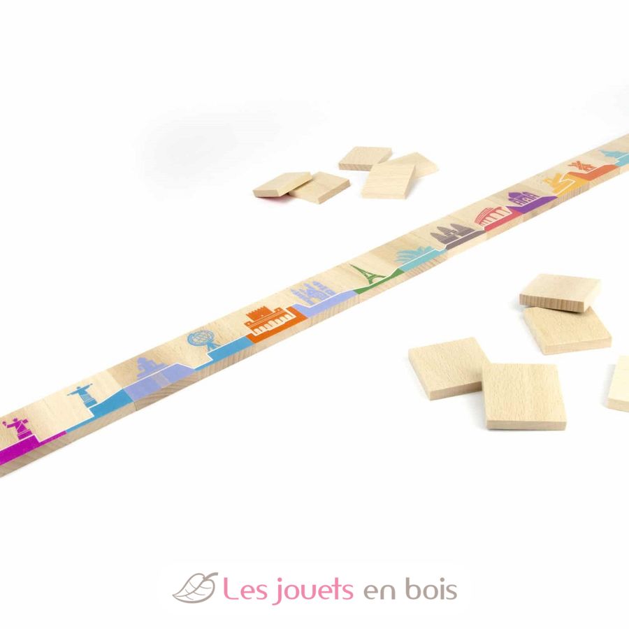 Este divertido juego de madera para toda la familia es un juego 2 en 1 que combina un juego de dominó tradicional con un juego de memoria para descubrir monumentos famosos.