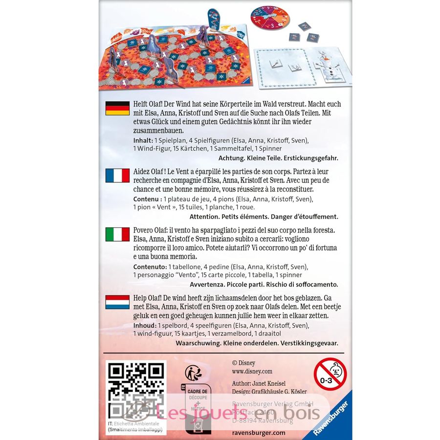 ¡Pobre Olaf! El viento se lo llevó y todas las partes de su cuerpo ahora están esparcidas en el bosque. Pero sus amigos Elsa, Anna, Kristoff y Sven se propusieron encontrar las diferentes piezas para volver a armarlo. ¿Con un poco de suerte y buena memoria, quizás puedas ayudar a nuestros amigos? Frozen 2: Olaf's Rescue es un juego de mesa para toda la familia. Coopera para ayudar a Olaf antes de que el viento vuelva a arrasar el bosque.
