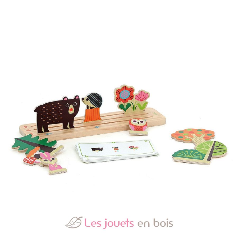 Si coloco el oso a la derecha del árbol, las setas deberían estar a la izquierda... Este juego de lógica de madera, ilustrado por Ingela P. Arrhenius, invita a tu hijo a partir de 3 años a colocar las piezas de madera en la posición correcta según las tarjetas de desafío.