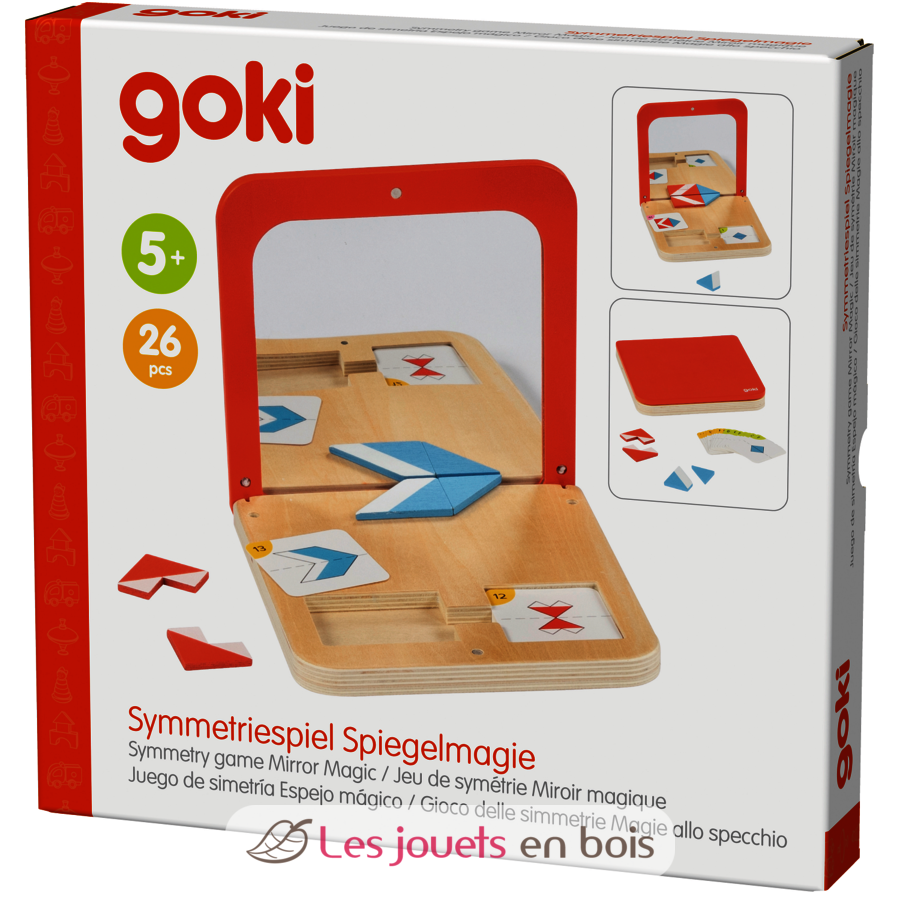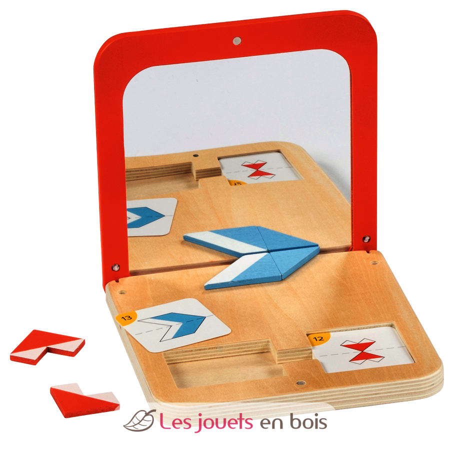 Los niños deben examinar cuidadosamente su tarjeta y colocar correctamente las piezas disponibles frente al espejo. Usando el reflejo, pueden recrear la imagen de su tarjeta de reto.