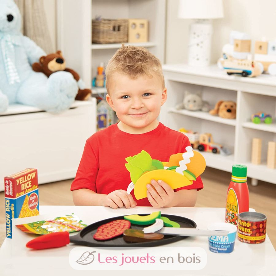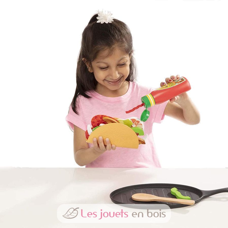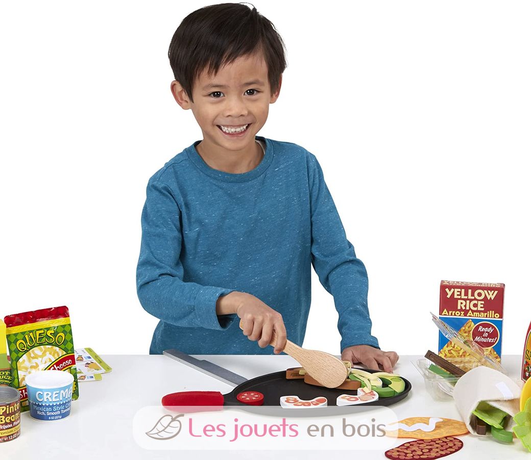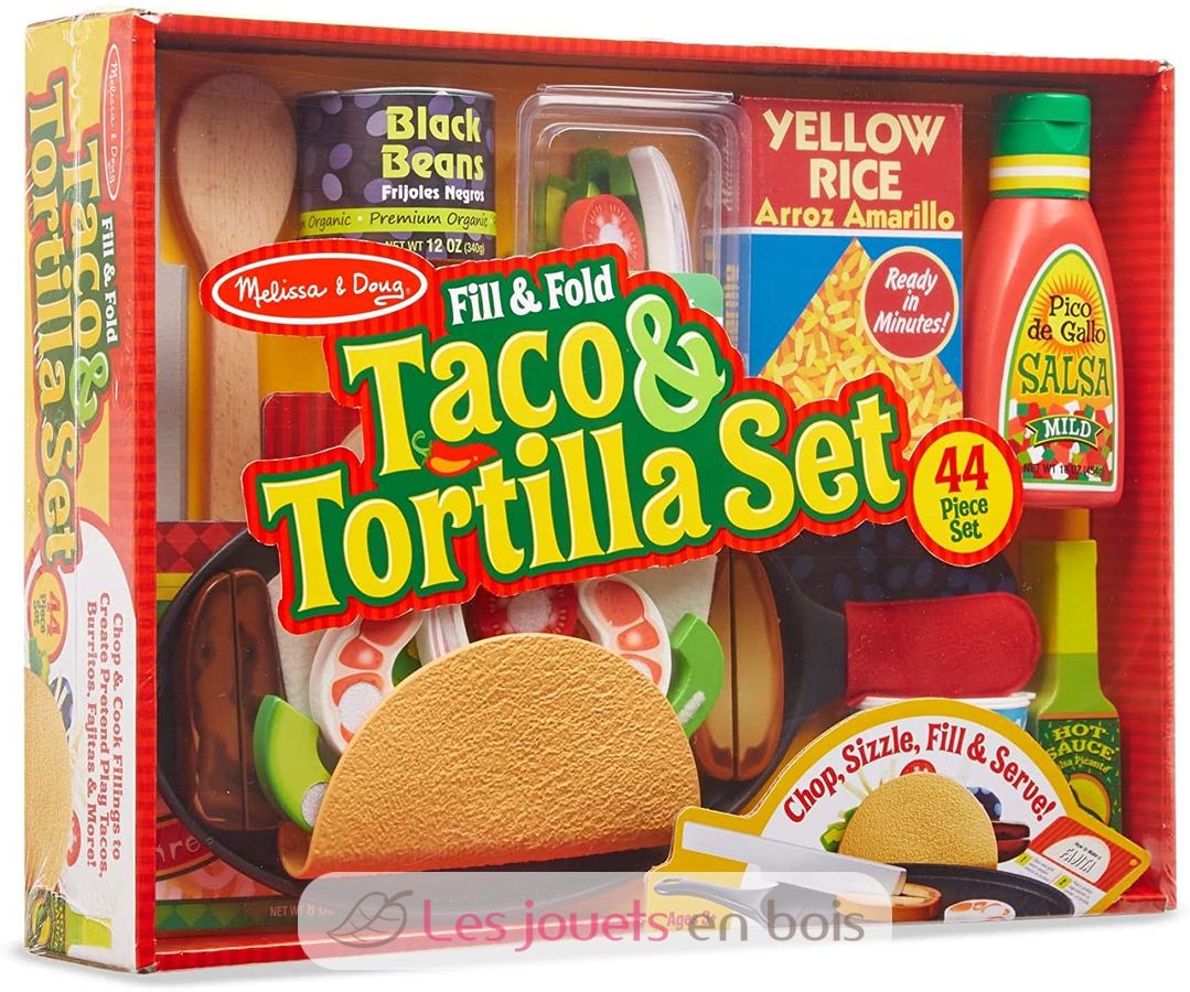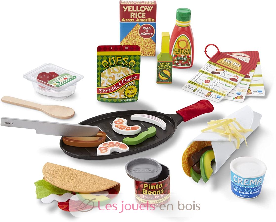Elige tus ingredientes, corta, asa, rellena, dobla y sirve deliciosos brebajes. Este completo set incluye una tortilla de fieltro, un taco duro, pollo, carne y camarones en madera, frijoles en lata con tapa, arroz en lata, frasco exprimible de salsa, queso en bolsa, emabalaje con tomate, aguacate, pimiento, cebolla y lechuga en madera, frasco de salsa picante en madera, crema agria en frasco con tapa, sartén con guante, cuchara y tenedor de madera, 3 tarjetas reutilizables de recetas y actividades de doble cara.