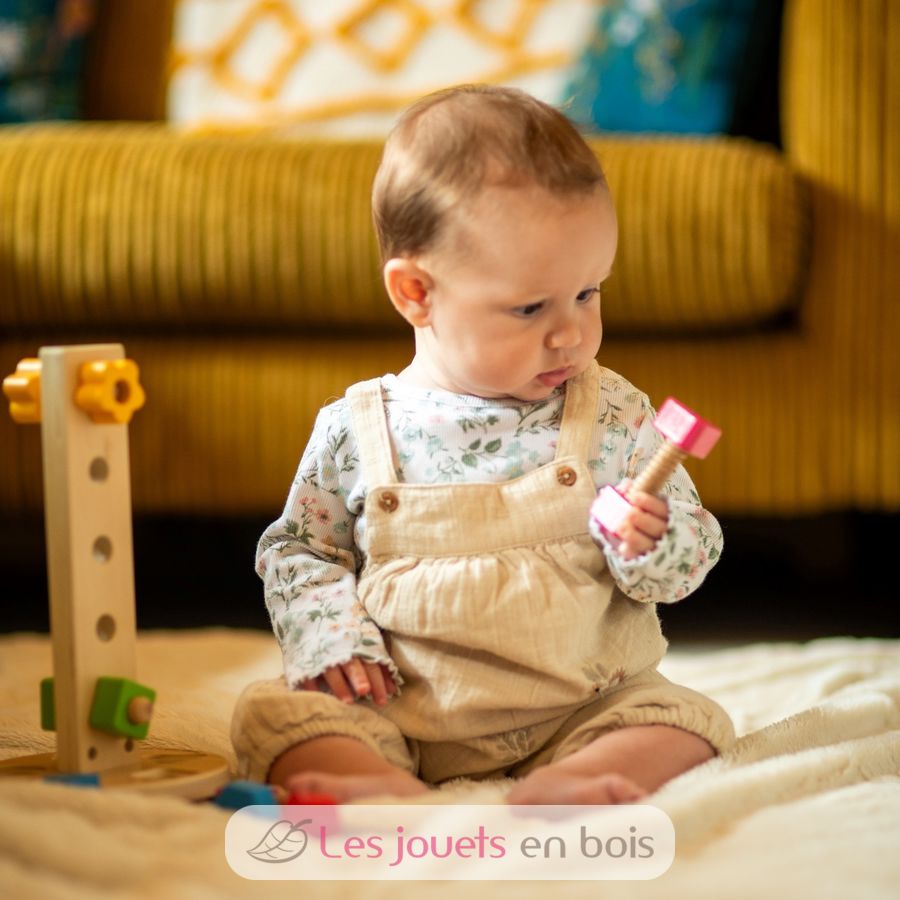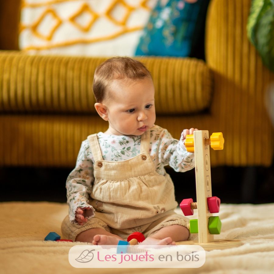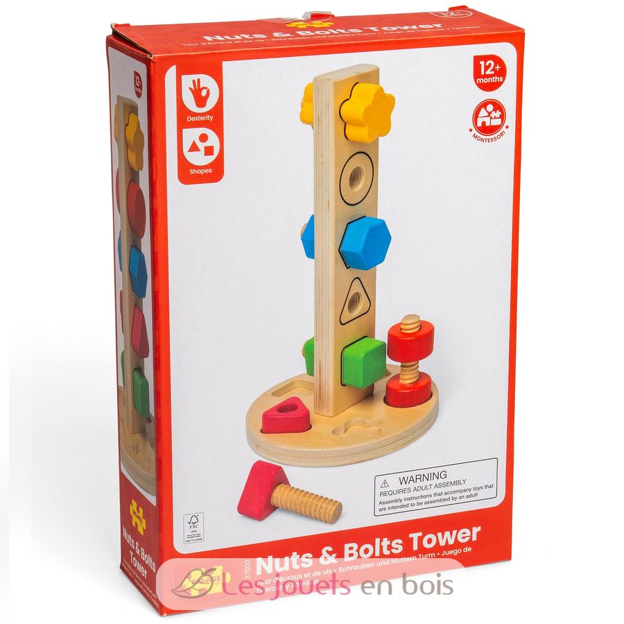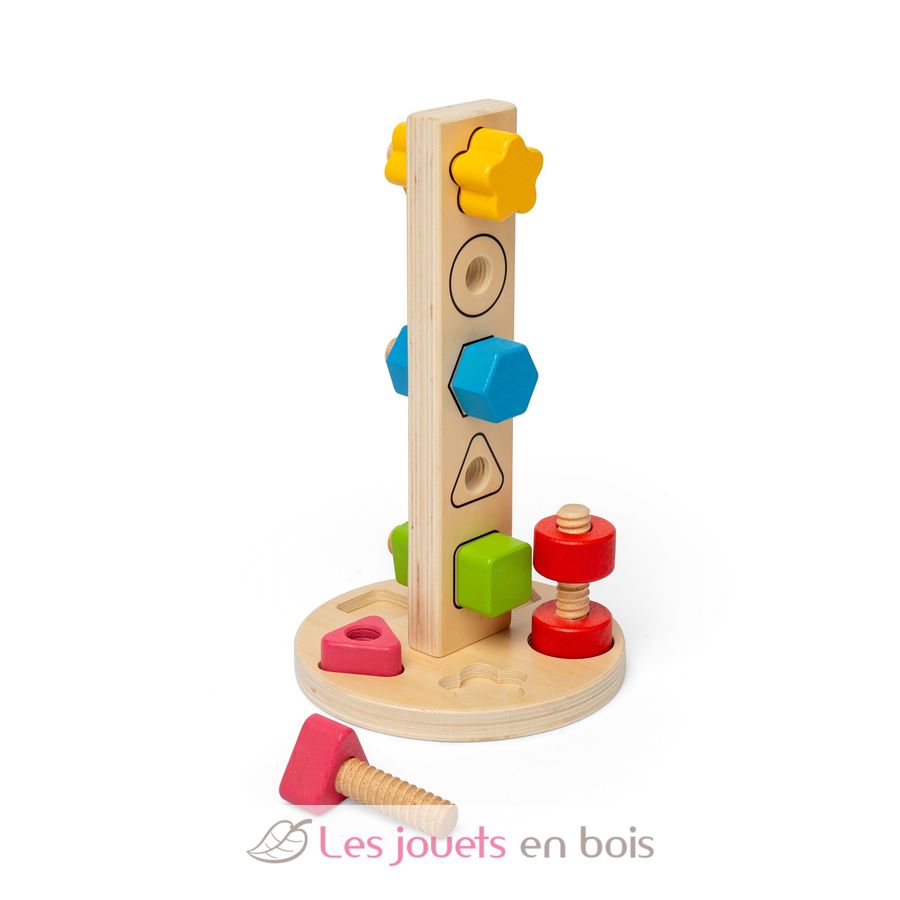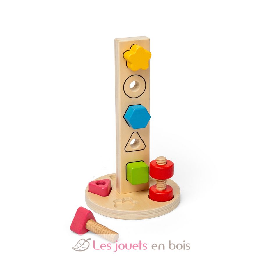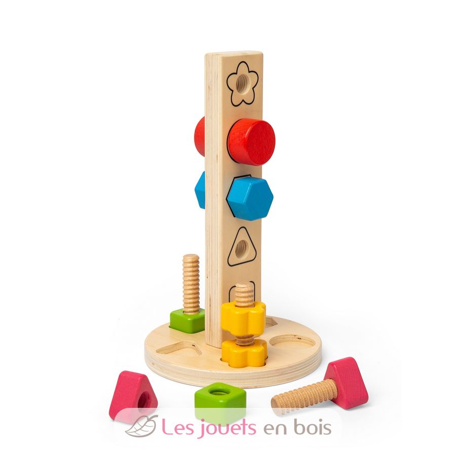 Diseñada para cautivar la curiosidad de los niños, esta torre de tuercas y tornillos les ayuda a desarrollar su motricidad fina a través del juego.