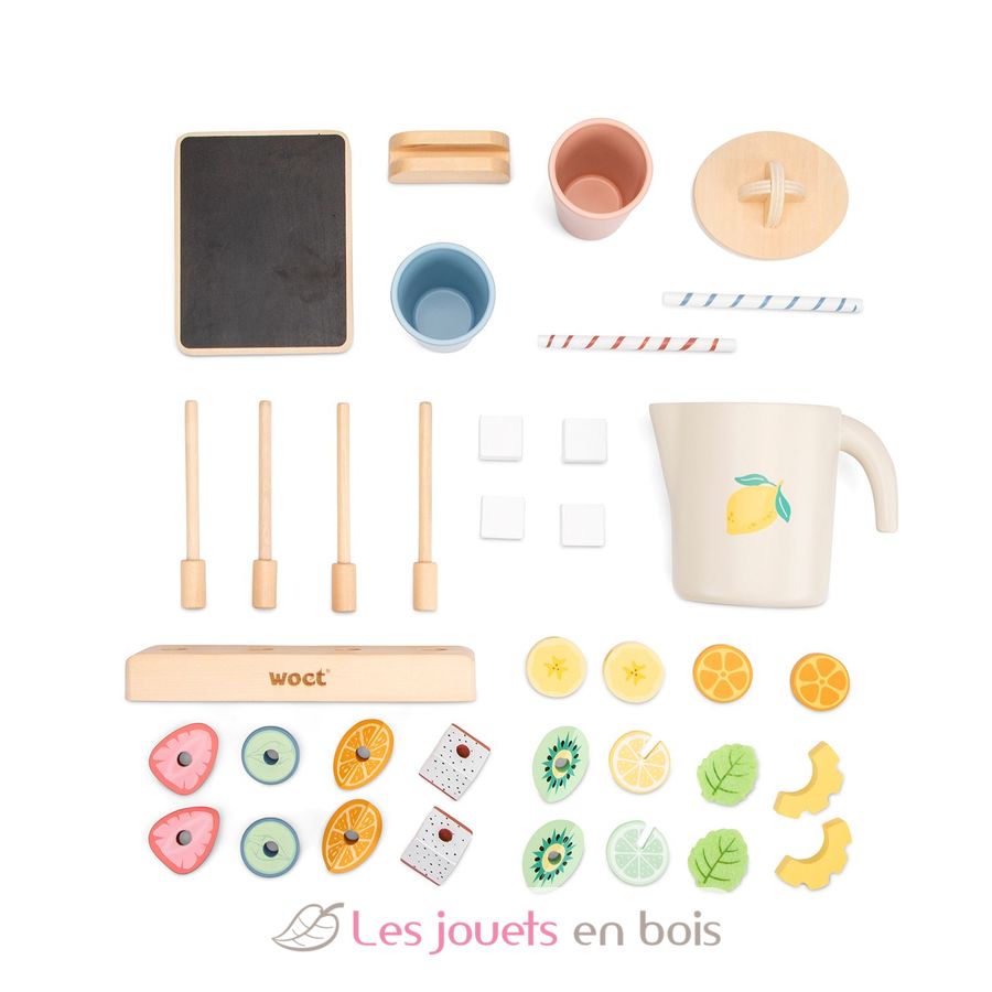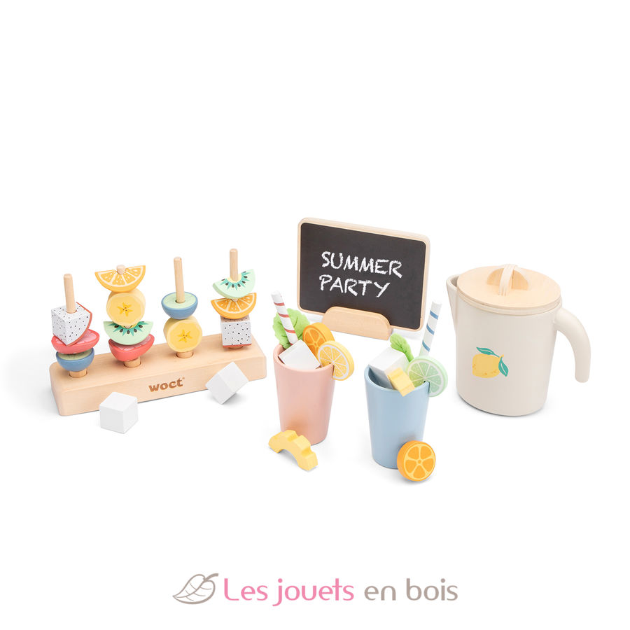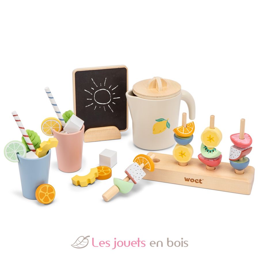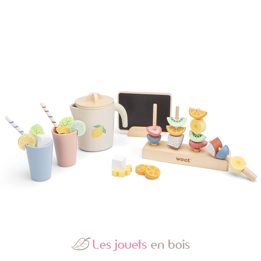 El set incluye dos vasos con ingredientes de frutas y pajitas de juguete, una jarra de limonada con tapa, una pizarra para los platos del día y cuatro brochetas de madera con soporte, además de un arcoíris de rodajas de fruta para crear deliciosas combinaciones de juego. Mientras los niños vierten, decoran y juegan, desarrollan la motricidad fina, despiertan la creatividad y disfrutan de un sinfín de diversión libre. Un complemento refrescante y divertido para cualquier cocina de juguete o cafetería de juego. ¡Buen provecho! Este juguete está hecho de madera 100% certificada FSC.
