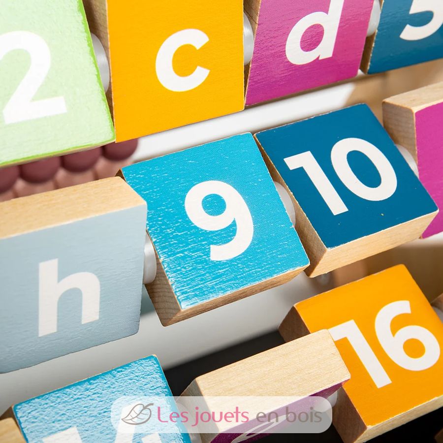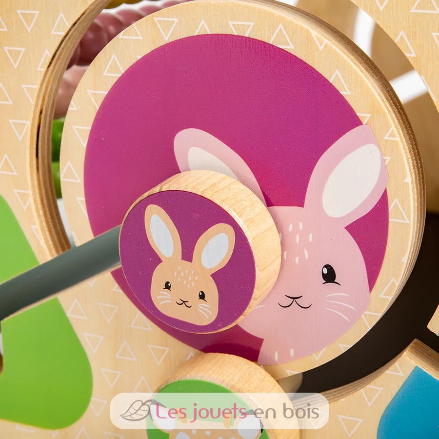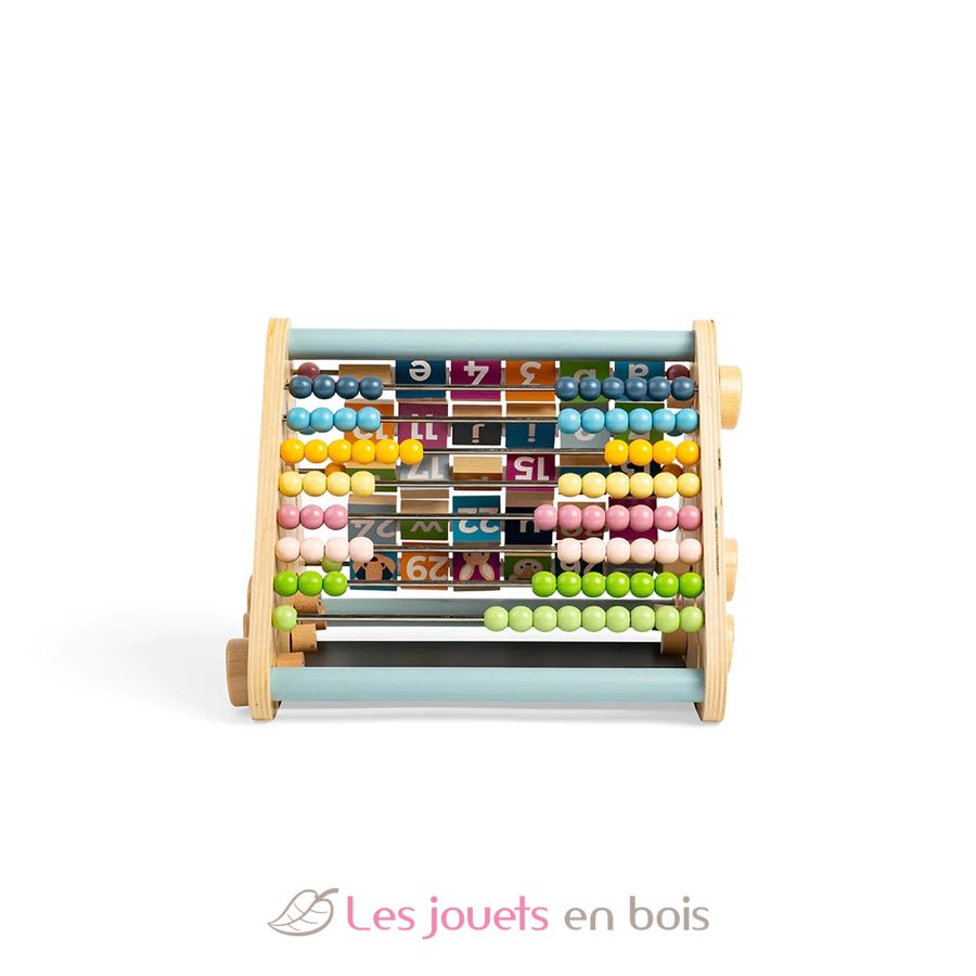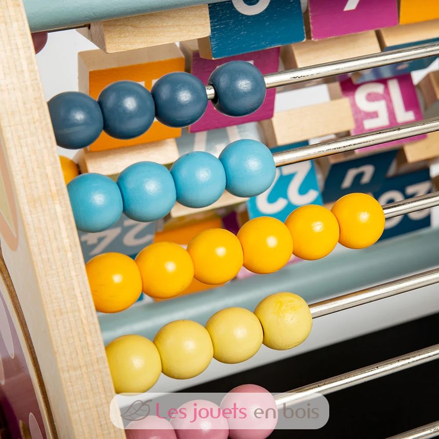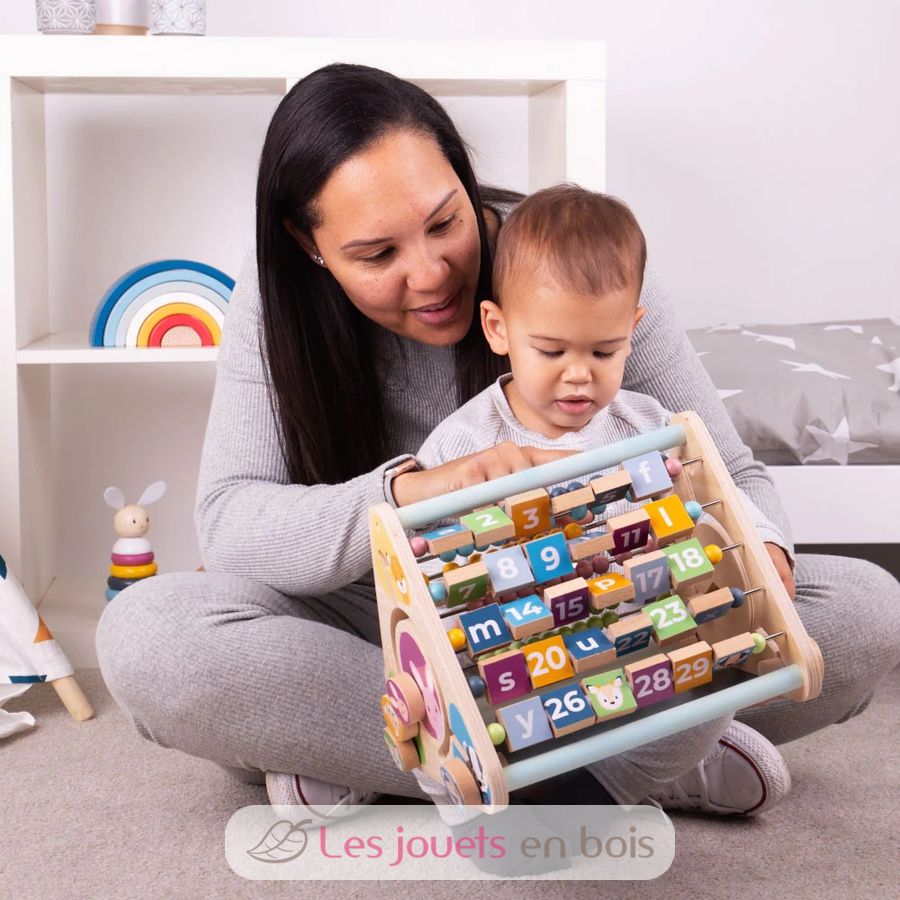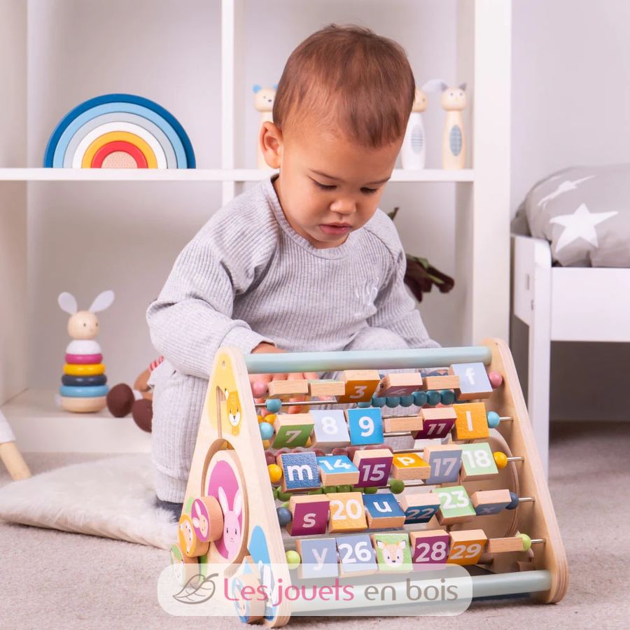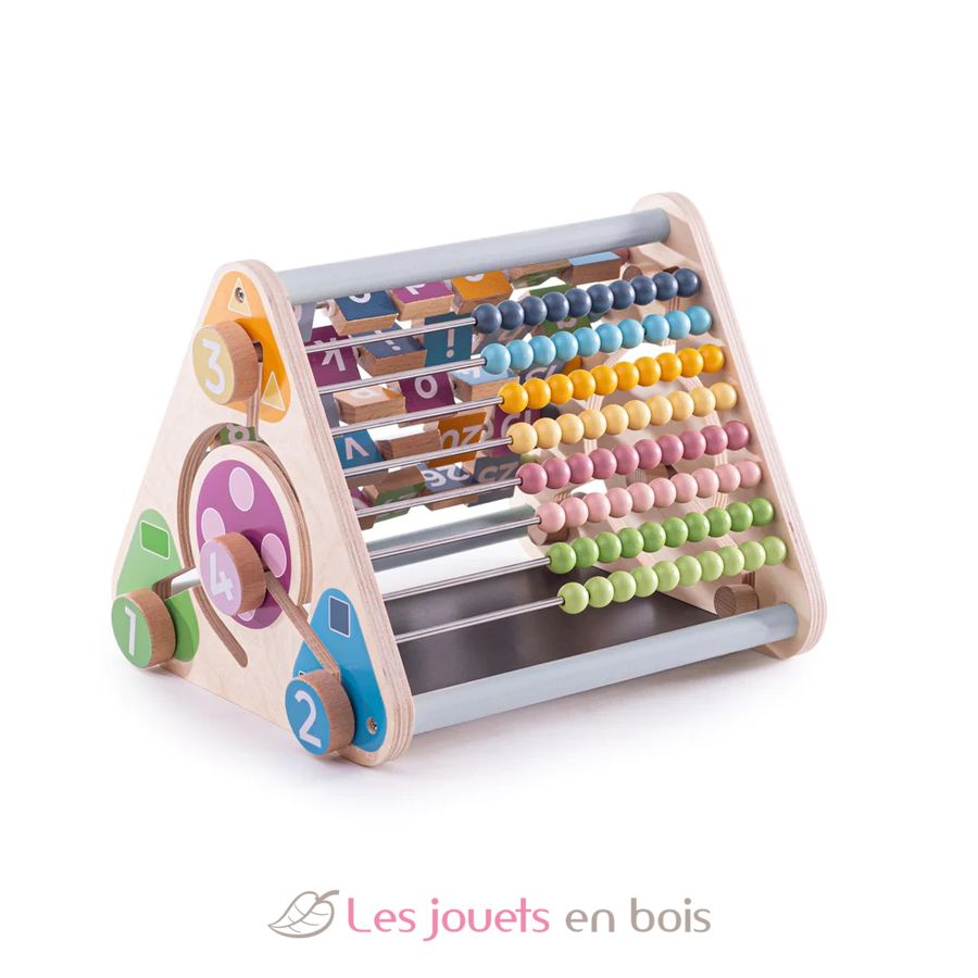 Este juguete de madera con certificado FSC ofrece 5 actividades para el despertar de los más pequeños: una actividad de clasificación (contar o emparejar animales), una pizarra, un ábaco y bloques con las letras del abecedario e imágenes.