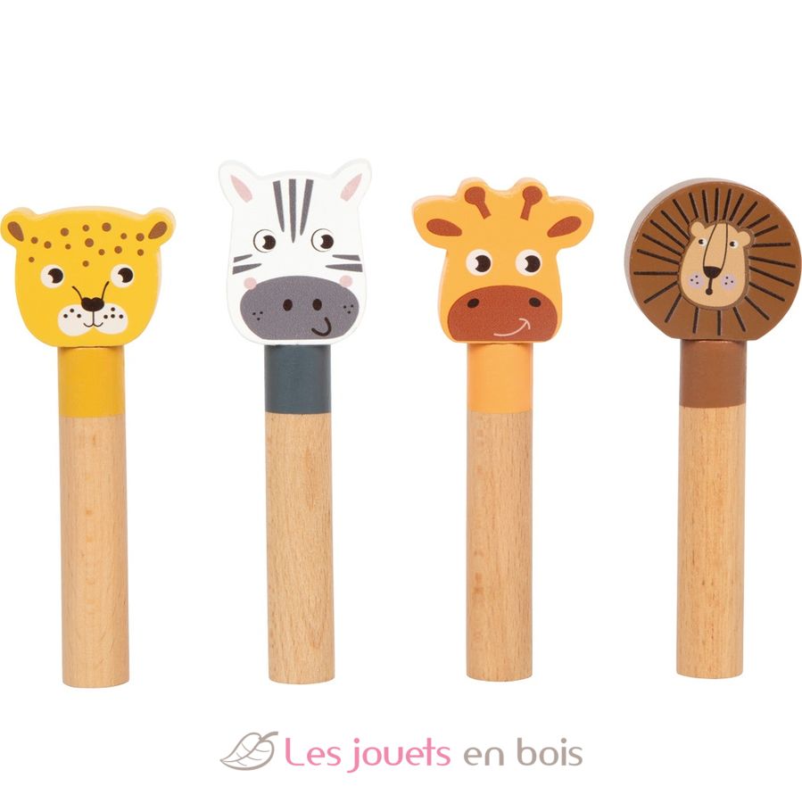 Descubre este bonito juguete pop-up compuesto por una escuela de madera y 4 palos con adorables cabezas de animales: girafa, león, cebra y leopardo