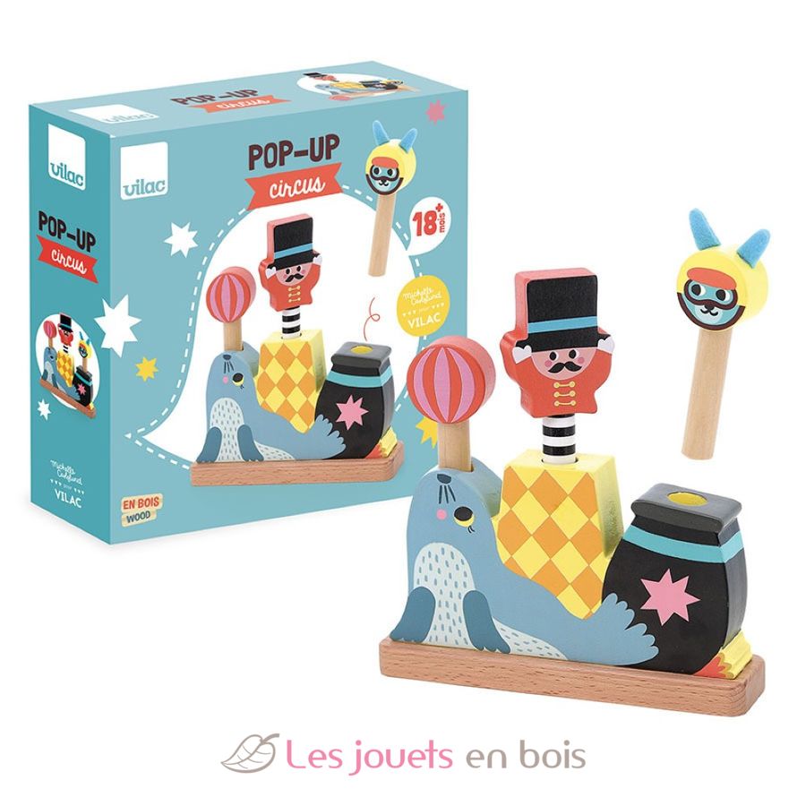 Juguete pop-up Circo, un juguete de actividades de madera de la marca Vilac. Referencia 8573.