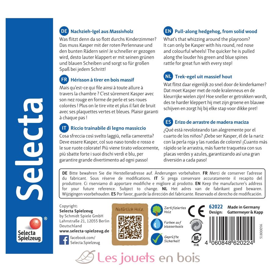 Kasper, el alegre y colorido erizo de clip-clap Pero, ¿qué es eso que atraviesa la habitación a toda velocidad? Debe ser Kasper Clip-Clap con su nariz roja perlada y sus ruedas de colores. Cuanto más rápido tires de él, más ruido hará con sus placas verdes y azules. ¡Diversión a cada paso! Un juguete de madera para tirar fabricado en Alemania por la empresa Selecta.