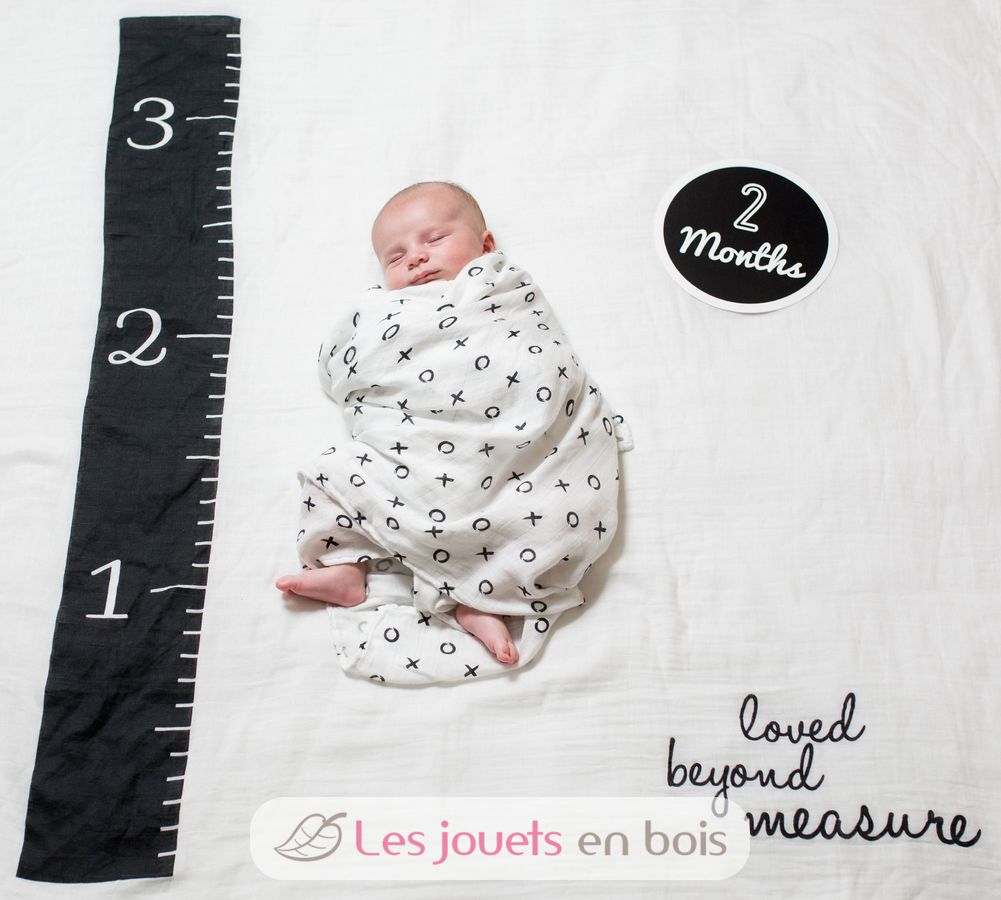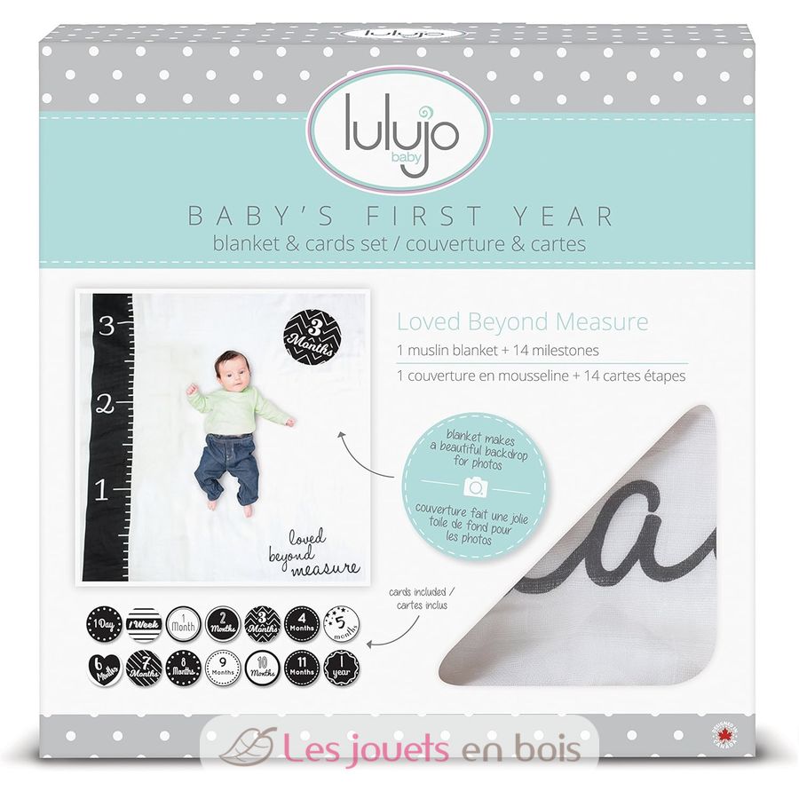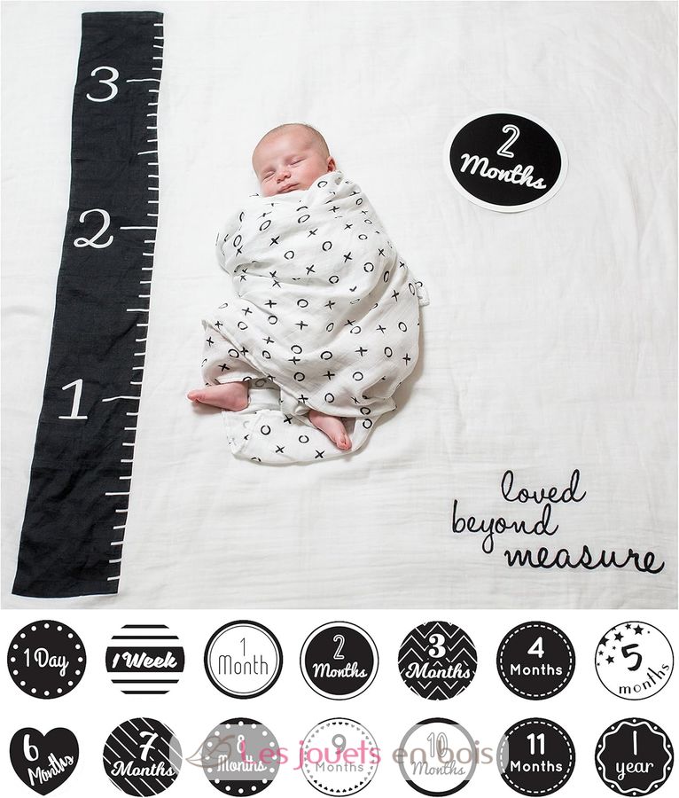 Este set "mi primer año" se compone de una manta de pañal de muselina de algodón y 14 tarjetas que muestran la edad del niño desde 1 día hasta 1 año. Las tarjetas están en inglés (1 día, 1 semana, 1 mes, etc...).