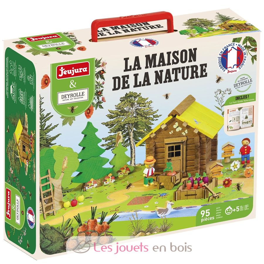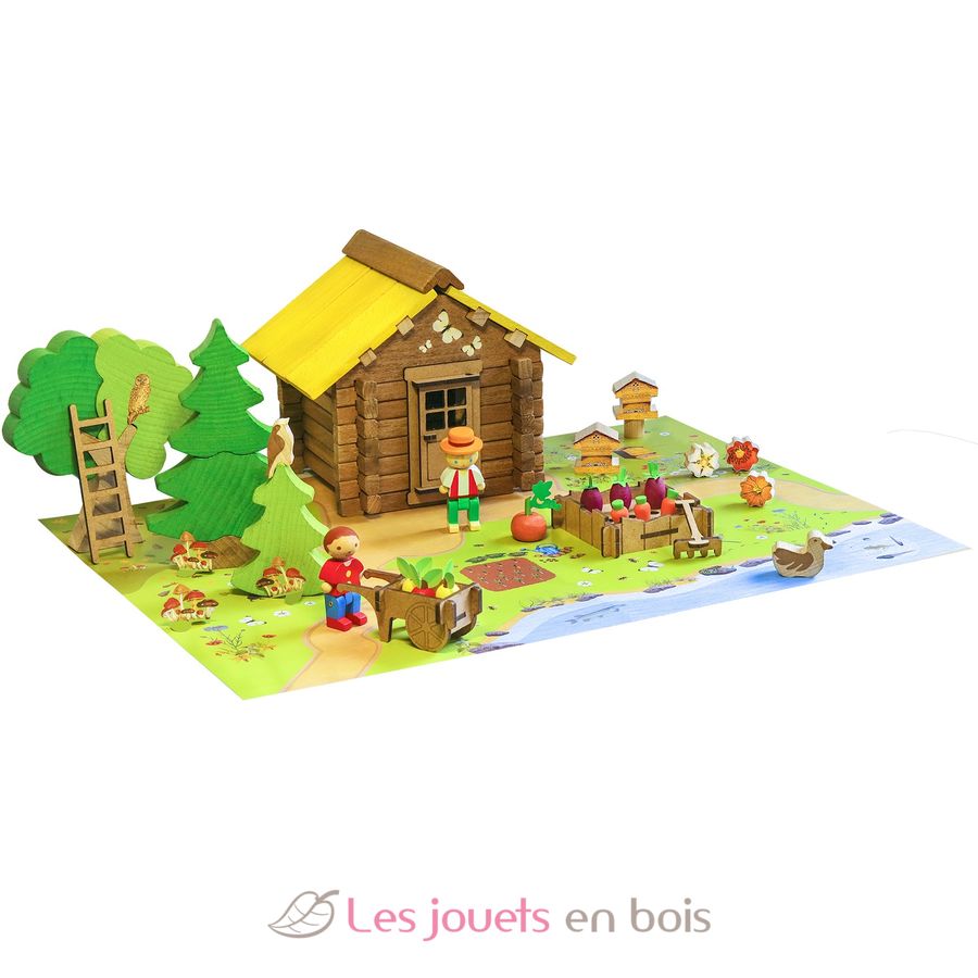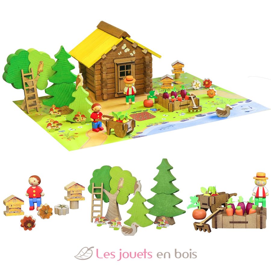 Este juego de construcción de 95 piezas de madera natural y teñida incluye una alfombra de juego, instrucciones de montaje y un folleto educativo, la "Guía Naturalista de Deyrolle (en francés)", que explora todos los temas destacados en la construcción: el huerto, el bosque y la polinización.