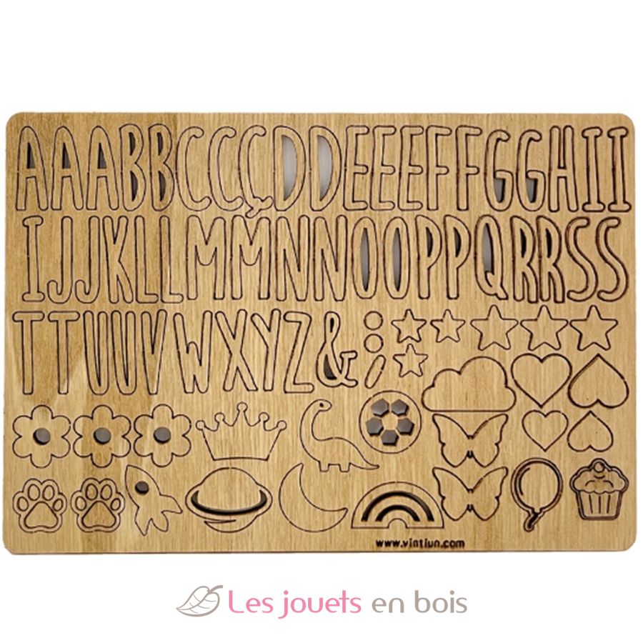 El kit incluye: 1 lámpara de madera y metacrilato con LED; 1 plantilla de letras y símbolos de madera autoadhesivos. Dimensiones: 16,7 x 16,9 x 6 cm. Zona personalizable: 11 x 6 cm.