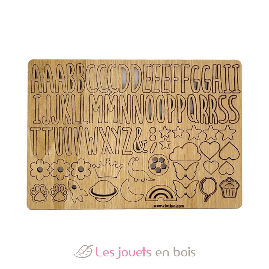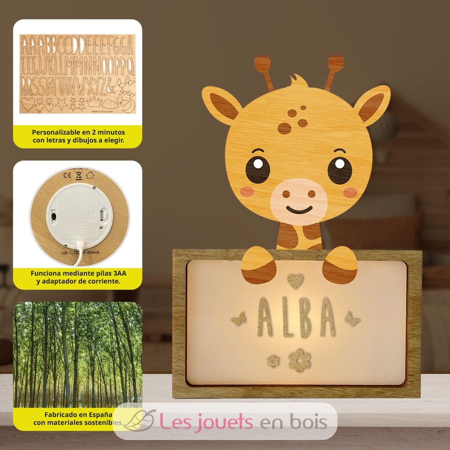 El kit incluye: 1 lámpara de madera y metacrilato con LED; 1 plantilla de letras y símbolos de madera autoadhesivos. Dimensiones: 16,7 x 16,9 x 6 cm. Zona personalizable: 11 x 6 cm.