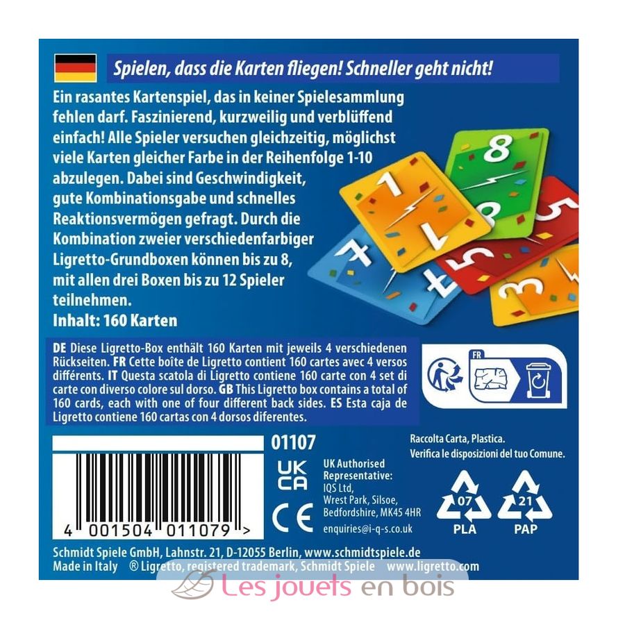 Si combinas dos juegos base de Ligretto de diferentes colores (disponibles en azul, verde y rojo), pueden participar hasta 8 jugadores. Y si usas los tres juegos de colores, pueden jugar hasta 12 jugadores.