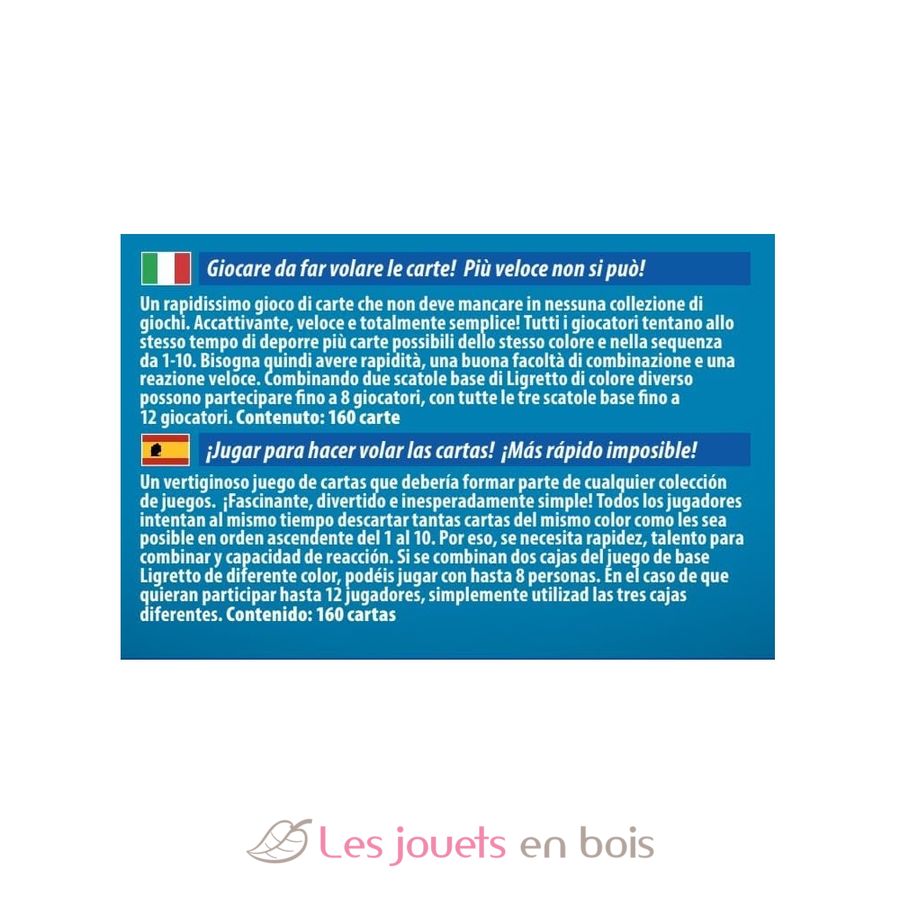 Contenido: 160 cartas con 4 dorsos diferentes. De 2 a 4 jugadores. A partir de 8 años. Tiempo de juego: 10 minutos.