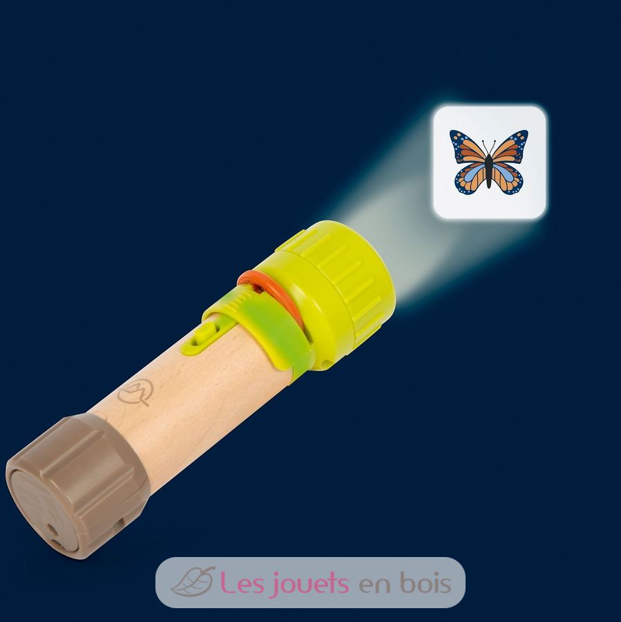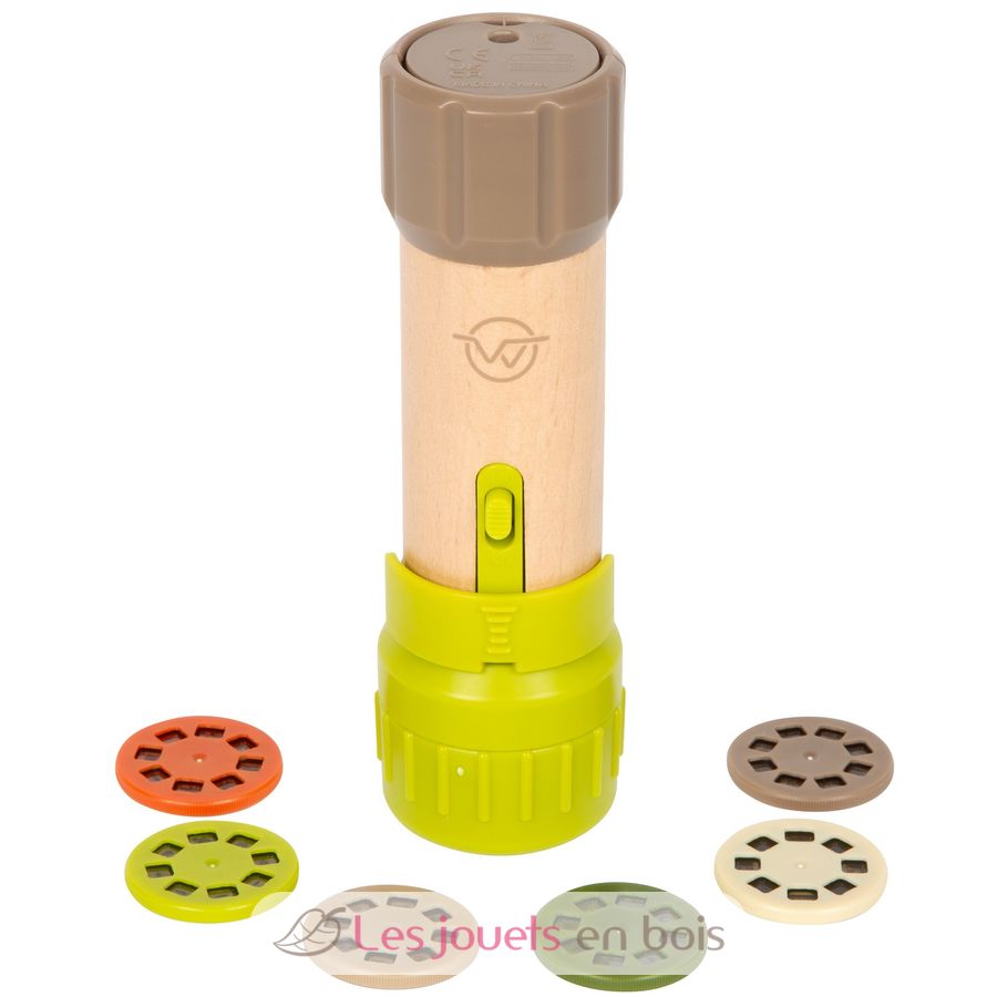La linterna para niños en formato ergonómico, fabricada en plástico resistente y con mango de madera natural, está repleta de conocimientos: seis ruedas de película intercambiables muestran diversos temas científicos, como el ciclo de desarrollo de las ranas, las mariposas y los dientes de león, las hojas y los frutos de los árboles, los animales y sus huellas, y las constelaciones. ¡Perfecto para los jóvenes naturalistas!