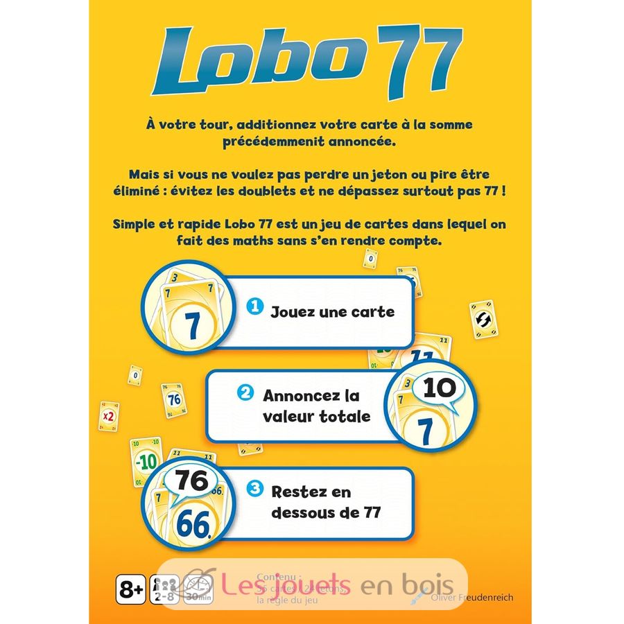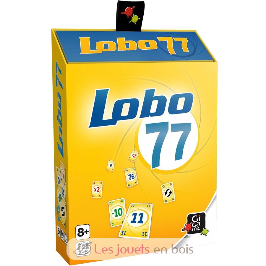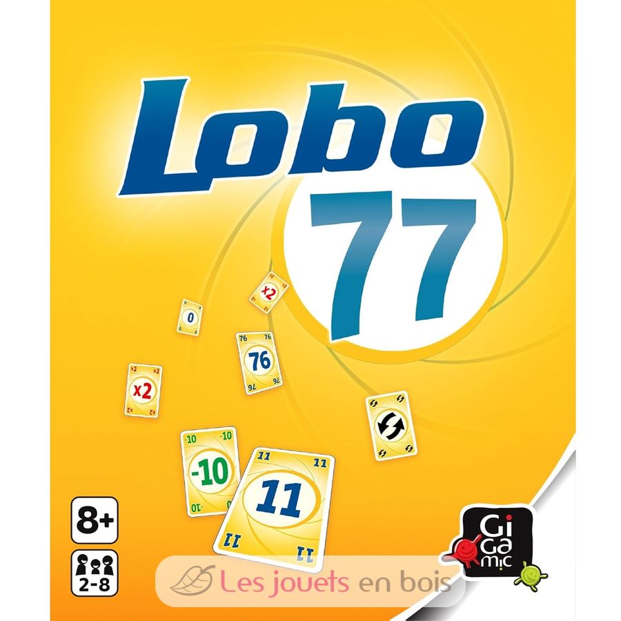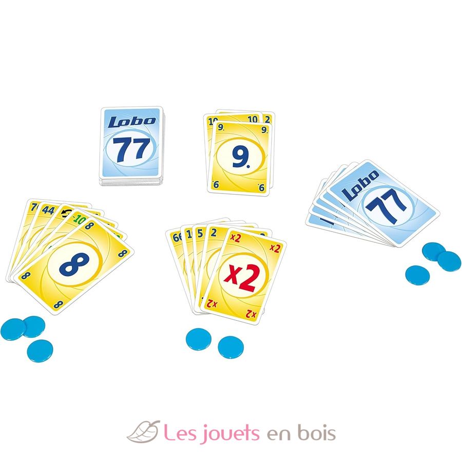 Cada jugador recibe 3 fichas y luego 5 cartas de un valor determinado. En cada ronda, añades una carta al mazo, anuncias el nuevo total de las cartas apiladas y luego robas una carta. Si el total anunciado es doble (11, 22, 33, etc.), ¡pierdes una ficha! Y si supera 77, la ronda termina. También se incluyen cartas especiales que pueden ayudarte o arruinarte. El último jugador con fichas al final de la partida gana. ¡Lobo 77 es un juego muy fácil y emocionante!