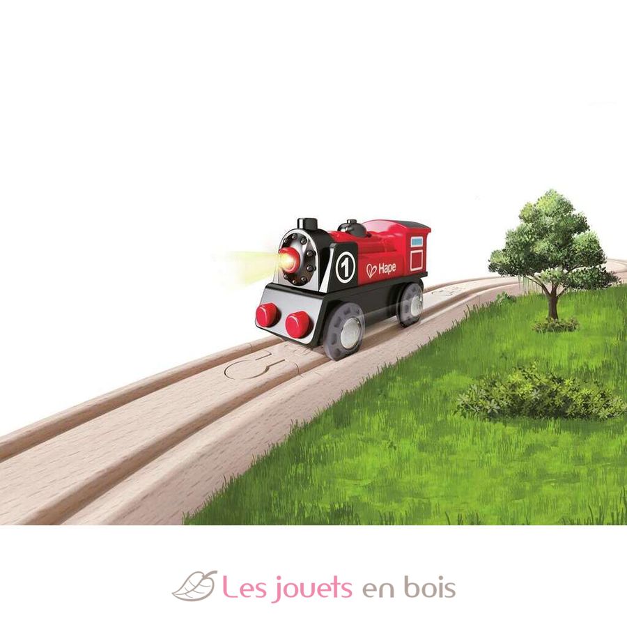 Pulsa el botón en la parte de arriba para que vaya adelante o atrás. La luz brillante ilumina el camino cuando la locomotora se mueve. También puedes conducir y empujar la locomotora tú mismo/a. Juega solo con este tren o combínalo con otros juegos de ferrocarril de madera.