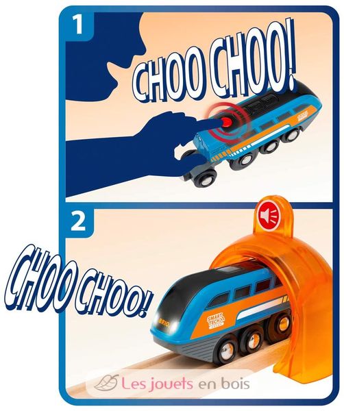 ¡Choo-Choo! Toma el control del juego con este tren interactivo. La locomotora grabadora de voz Smart Tech Sound es inteligente. Funciona con pilas (2 pilas AAA no incluidas) y está repleto de divertidas funciones tecnológicas. Es capaz de transportar las cargas más pesadas. Utiliza el botón rojo de la locomotora para grabar tus propios sonidos y luego escúchalos mientras la locomotora pasa por debajo del pórtico en la función "Sonido". La tecnología Smart Tech Sound permite a la locomotora comunicarse con su entorno. La locomotora responde automáticamente a los accesorios Smart Tech reaccionando con efectos de luz, movimientos o sonidos que apoyan aún más la imaginación de los niños.