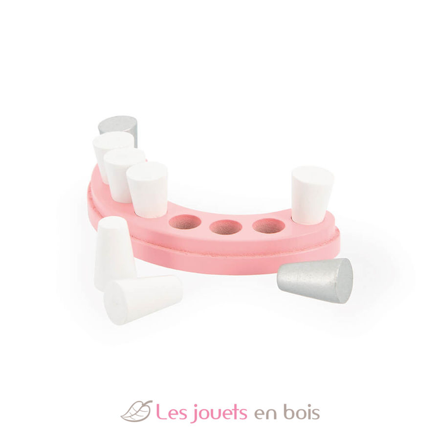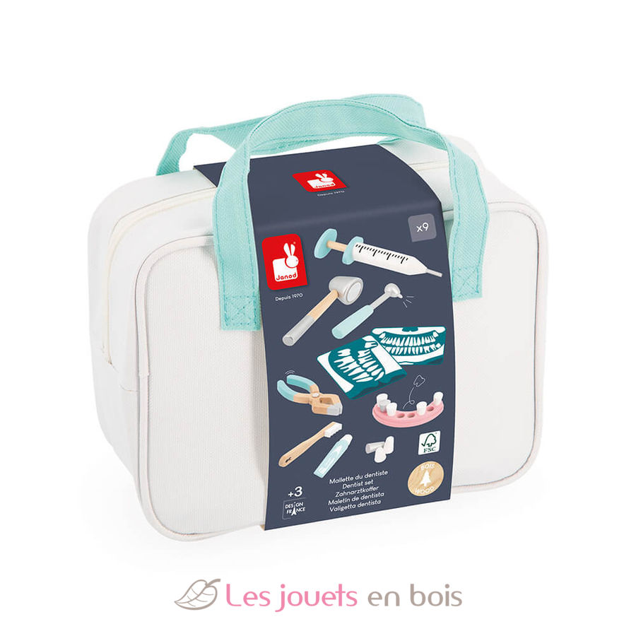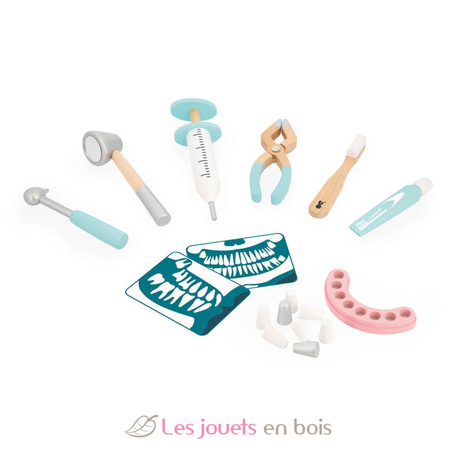 Este maletín de juego contiene 9 accesorios, 7 de ellos de madera: unas pinzas, una jeringuilla para la anestesia, una dentadura postiza con 8 dientes extraíbles, un espejo dental para encontrar la caries más escondida, un torno, un tubo de dentífrico y un cepillo de dientes para que el paciente pueda salir con sus pequeñas muestras! 2 tarjetas que ilustran las radiografías dentales permiten a los niños hacer sus diagnósticos.