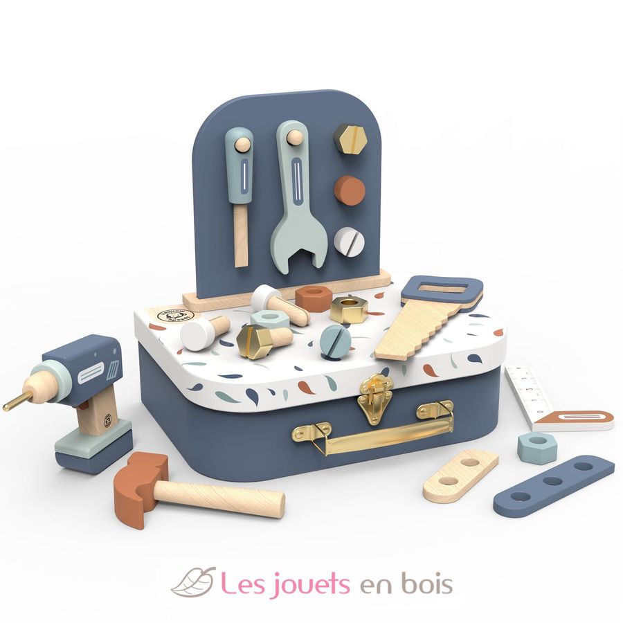Este kit de herramientas se transforma en un pequeño banco de trabajo con sus 19 accesorios de madera para construir y reparar. Permite a los niños explorar el mundo de las herramientas y la construcción a través del juego libre y creativo.