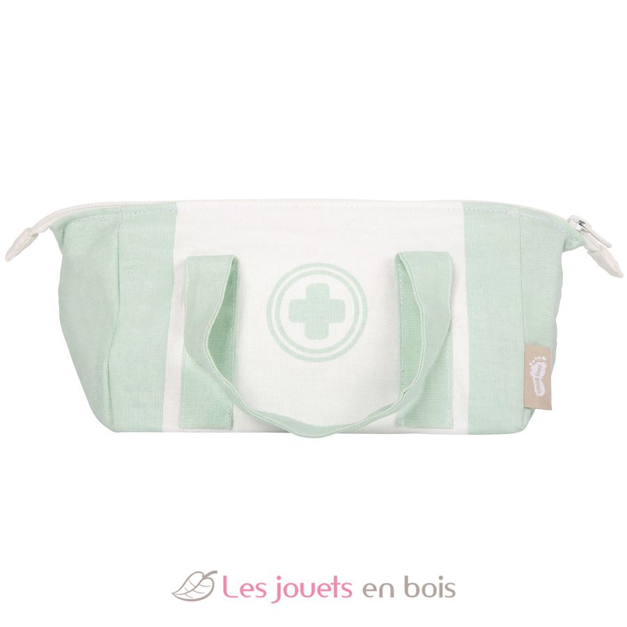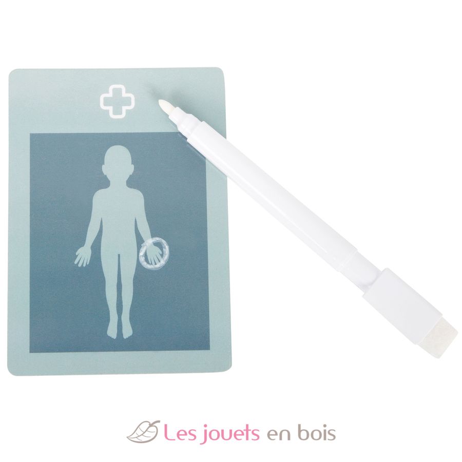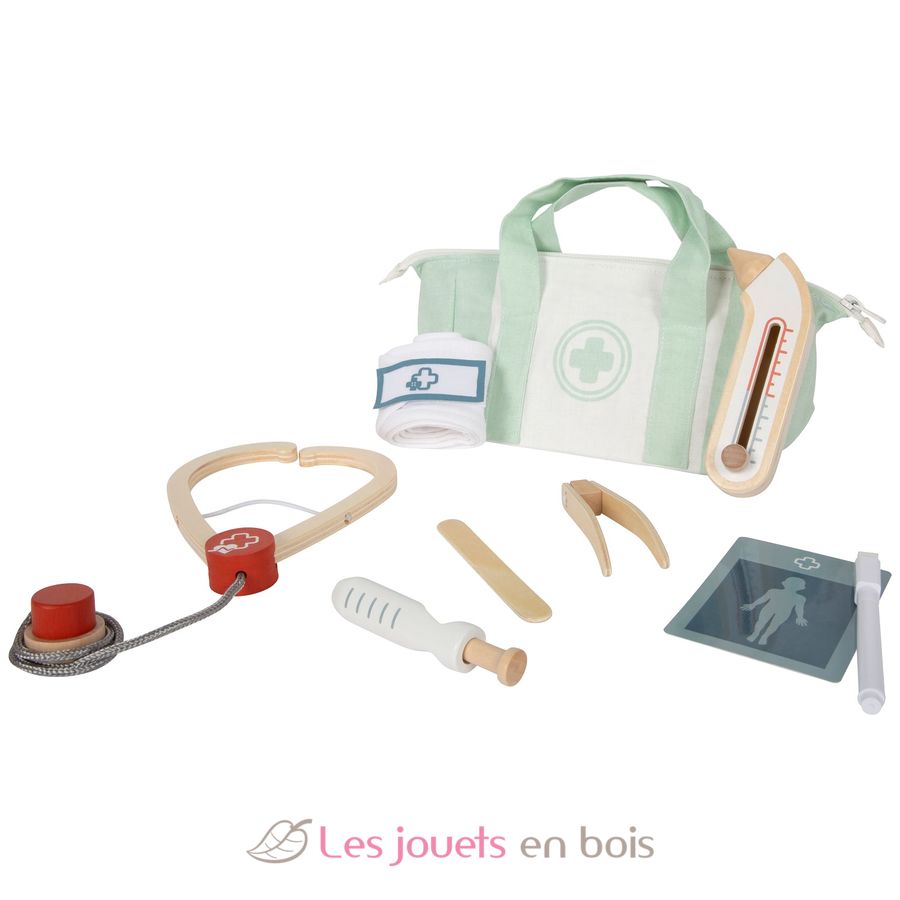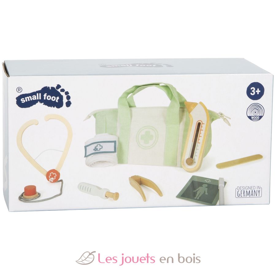 Este maletín de médico contiene utensilios médicos de madera cuidadosamente seleccionados, empaquetados en una resistente bolsa de tela con cremallera y prácticas correas de transporte. Incluye un estetoscopio, una jeringuilla retráctil automática, un termómetro clínico con pantalla ajustable, unas pinzas, una espátula, una venda con cierre de velcro y una tarjeta de paciente con bolígrafo.