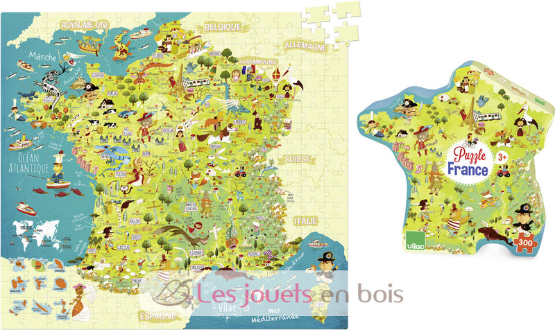 Puzzle de madera de 300 piezas que representa el mapa de Francia y sus maravillas. Dimensiones del mapa: 50 cm x 55 cm.