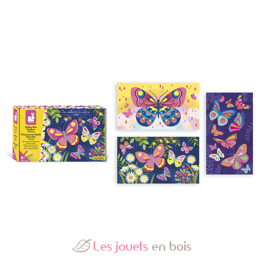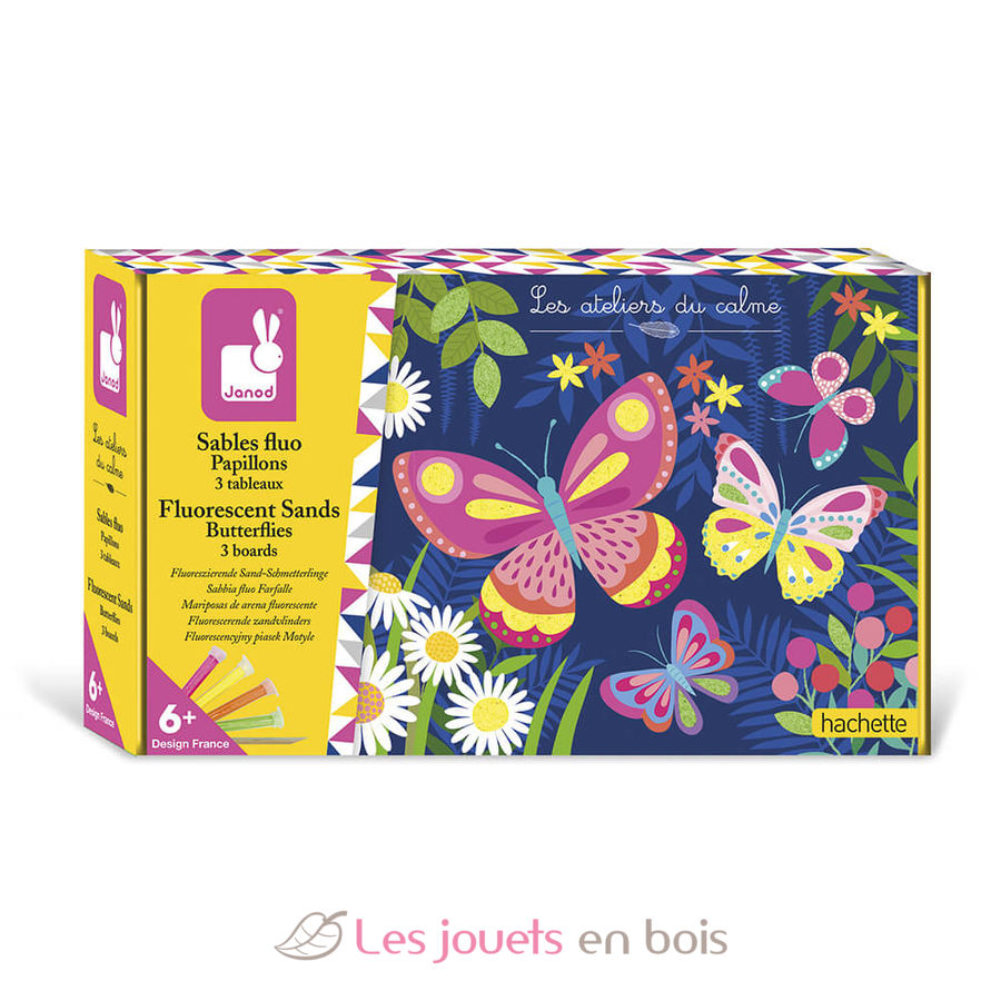 Descubre el kit creativo Arena fluorescente Mariposas de Janod, una actividad creativa con arenas de colores para niños a partir de 5 años. Una actividad creativa que aporta calma, concentración y serenidad.