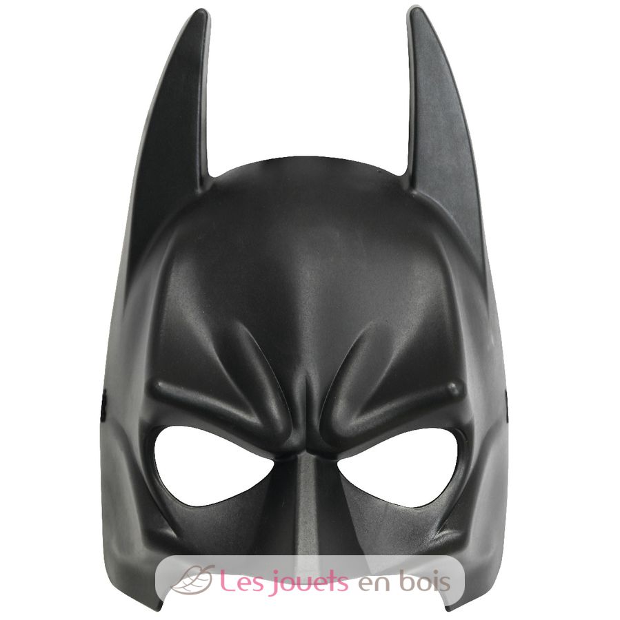Esta máscara infantil está hecha de PVC negro y presenta la imagen del superhéroe Batman. Tiene una correa elástica con cierre de velcro en la espalda y aberturas para los ojos.