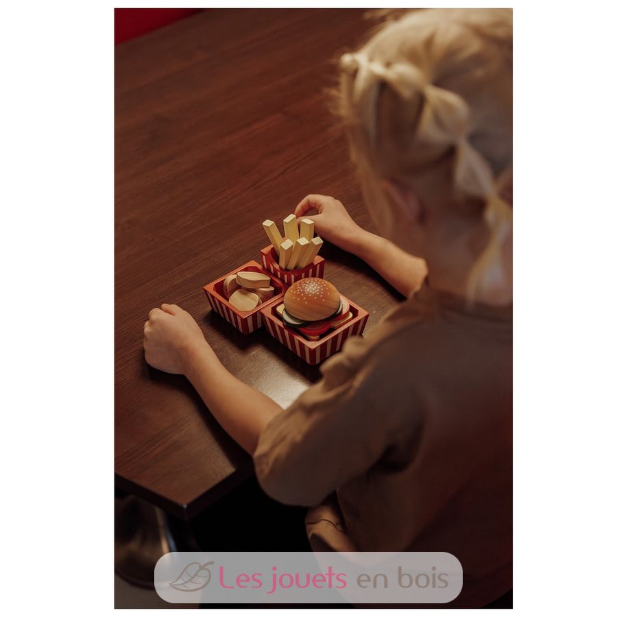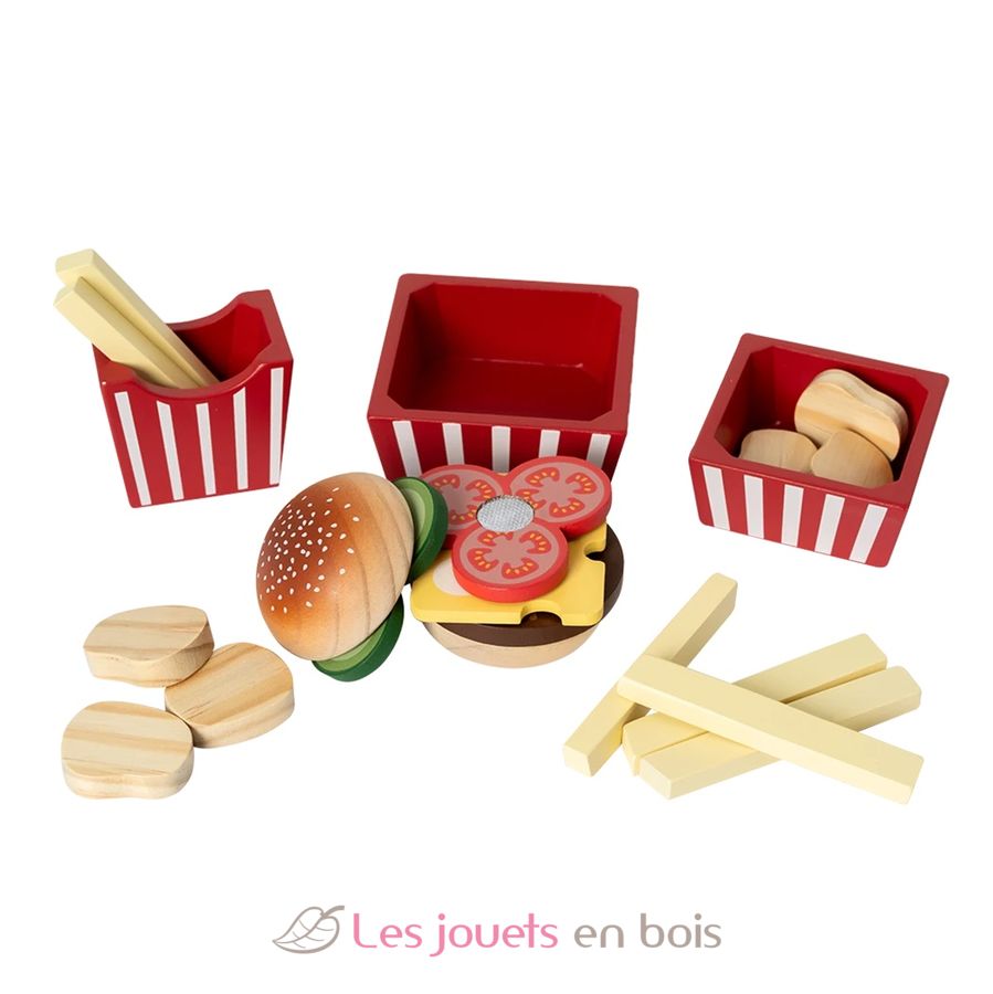 El set incluye una hamburguesa de madera realista, un jugoso trozo de pollo y crujientes patatas fritas, todo cuidadosamente empaquetado en tres recipientes a rayas rojas y blancas para mayor diversión y autenticidad. Los niños pueden crear sus propias hamburguesas personalizadas, servir patatas fritas crujientes e incluso cambiar ingredientes para una nueva creación cada vez que juegan.