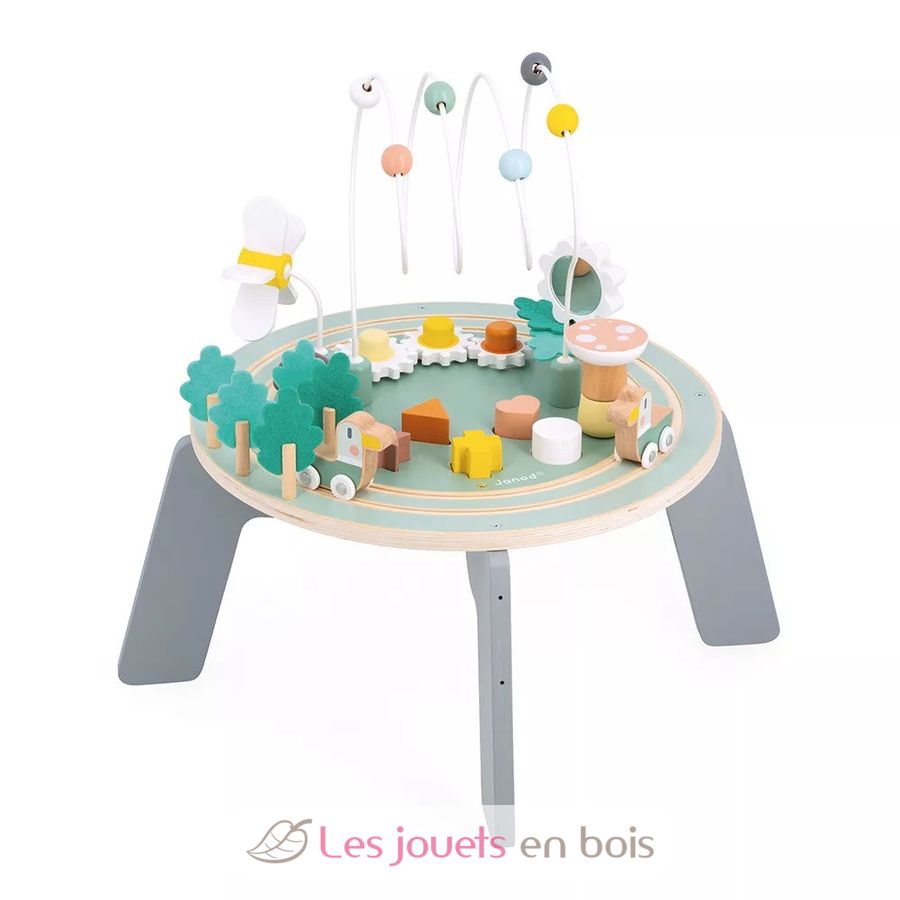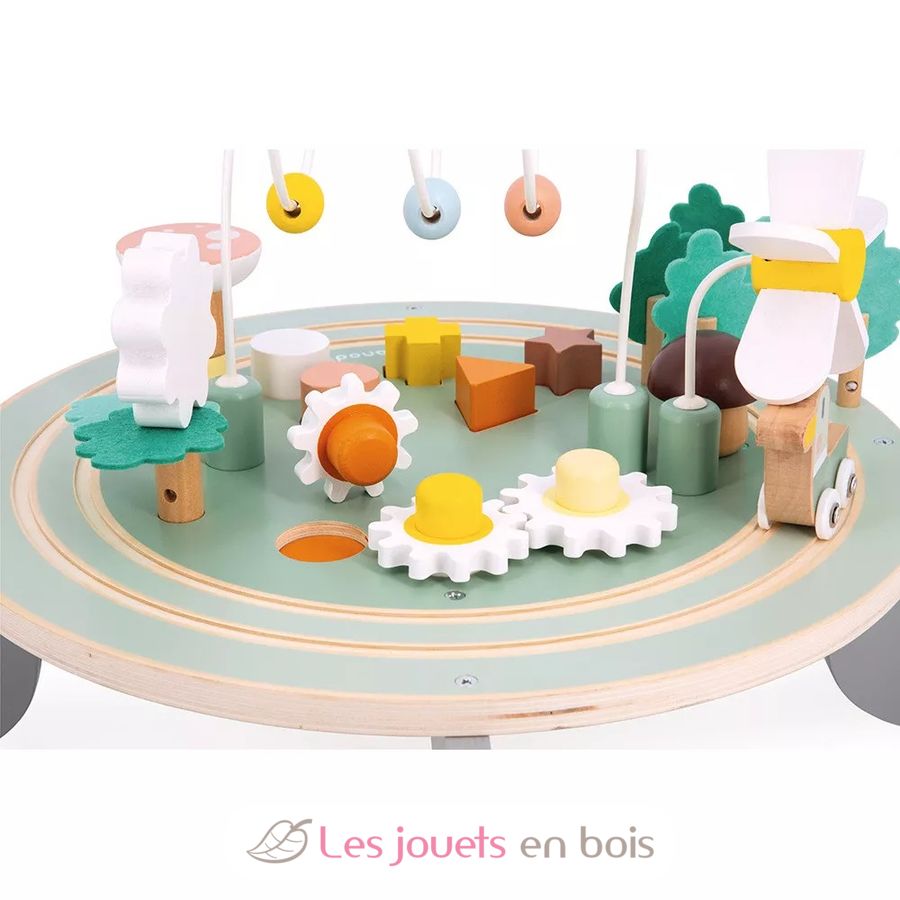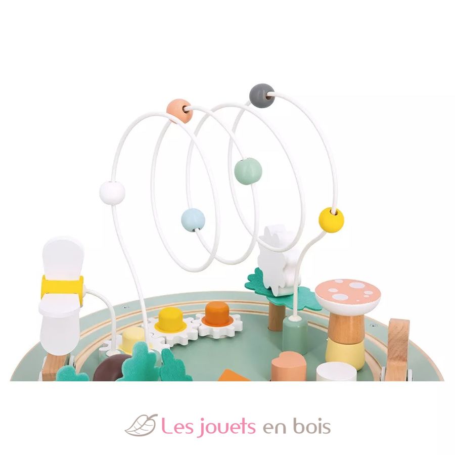 Con sus 9 actividades y su altura regulable, es un completo juguete de estímulo ideal para los pequeños a partir de 12 meses. Al bebé le esperan muchos descubrimientos, trabajo de motricidad y estímulos para sus sentidos, reunidos todos en un tierno escenario campestre. Esta mesa multiactividades tiene: 1 seta grande apilable, 5 formas de diferentes colores para encajar, 1 bosque de 5 árboles en fieltro suave, 1 margarita apilable con efecto espejo para mirarse, 1 looping grande, 3 engranajes en forma de flor para girar, 1 seta con efecto sonoro, 2 patitos que ruedan por los raíles que dan la vuelta al tablero y 1 molino de viento que gira cuando pasan por debajo.
