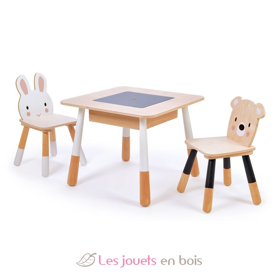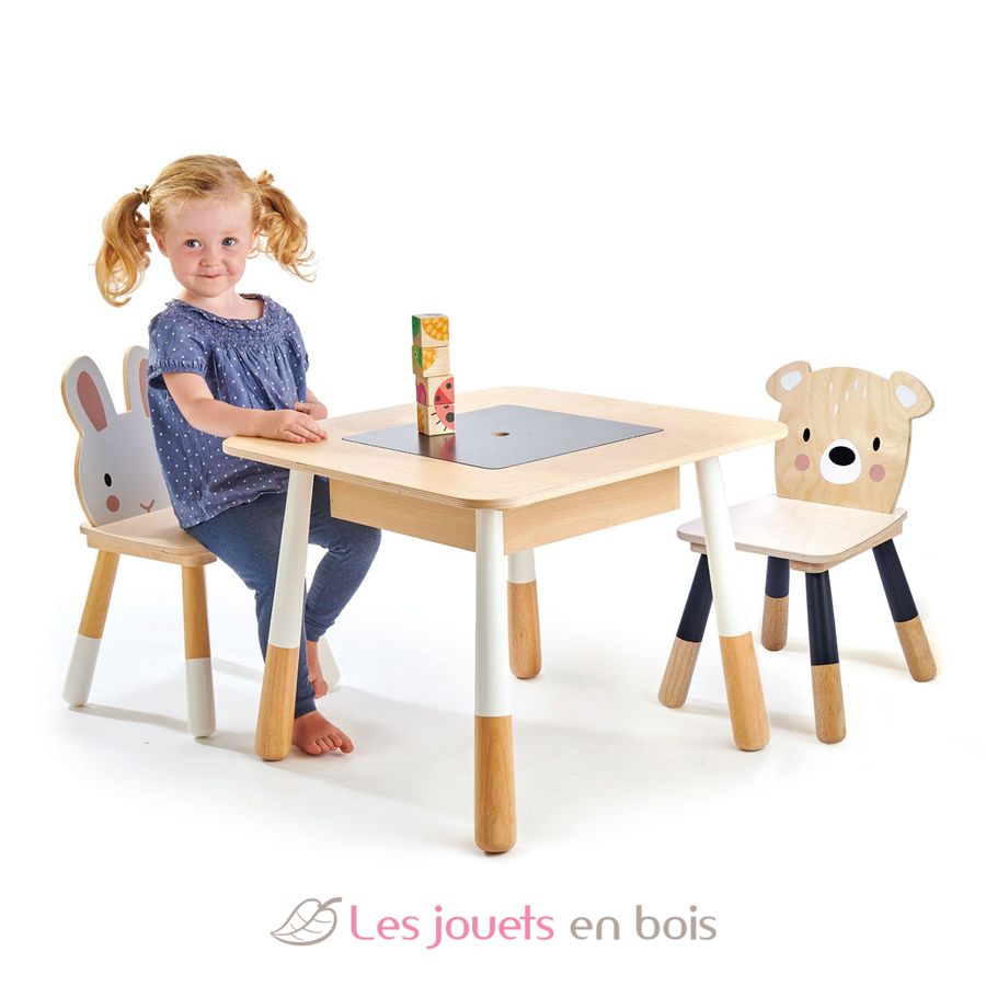 ¡A tus hijos les encantará pasar horas y horas pintando, dibujando o charlando alrededor de esta preciosa mesa infantil! Una mesa fabricada en MDF y madera de caucho con un panel central de pizarra extraíble. Al retirar el panel, descubrirás un compartimento para guardar lápices, dibujos, etc. Esta mesa infantil viene con 2 sillas (una silla oso y una silla conejo). Medidas de la mesa: 56 x 56 x 44,7 cm. Medidas de la silla: 30 x 30 cm (altura del asiento: 27,5 cm). Mesa y sillas de madera infantiles de la marca Tender Leaf Toys. Referencia TL8801.