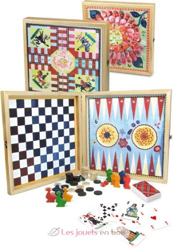 Un conjunto de juegos tradicionales de fabricación francesa en caja.