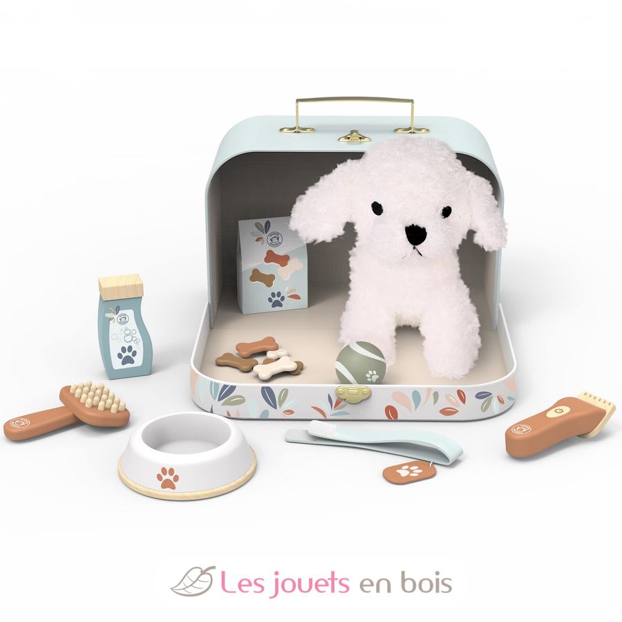 Los niños tendrán todo lo necesario en esta maleta de bonito diseño para cuidar de su perro de peluche favorito (incluido).