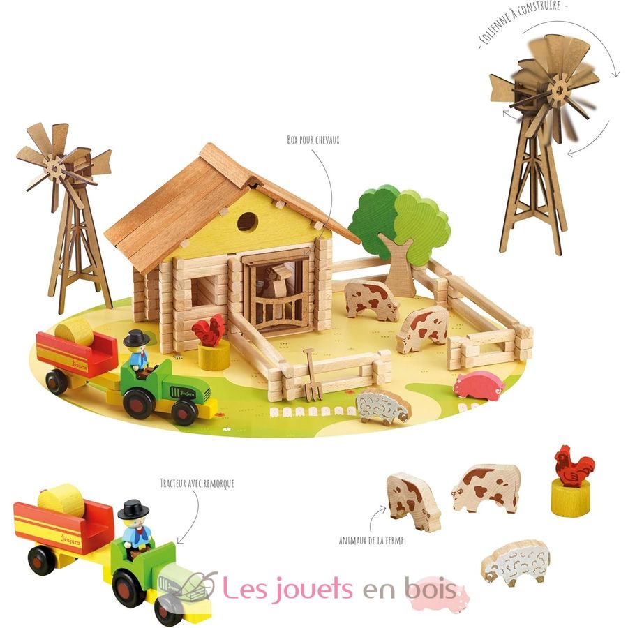 Un set de construcción de 145 piezas de madera natural y teñida con tapete de juego, instrucciones de montaje, un tractor con remolque, un aerogenerador y figuras de animales.