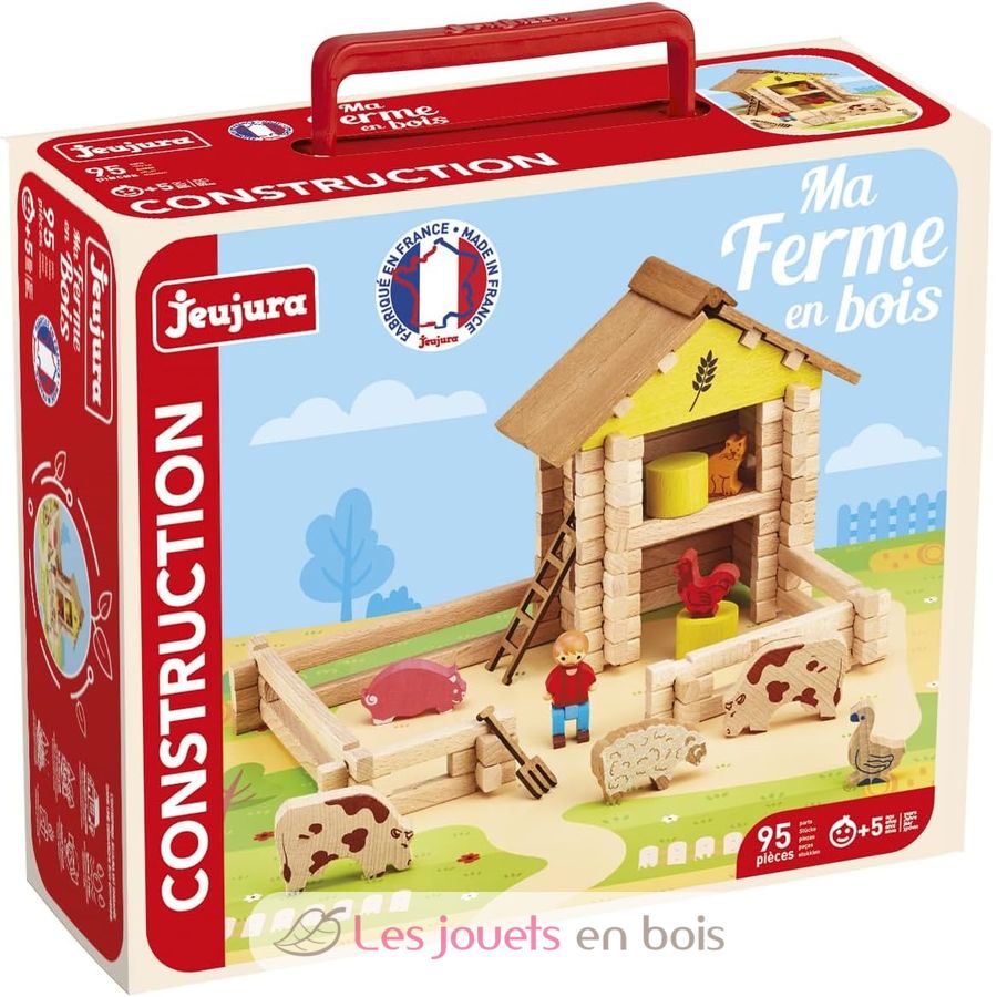 Una casa de campo de madera para construir, ideal para crear un mundo de juego y descubrir la granja y sus animales: vaca, oveja, gallo, ganso, gato, etc.