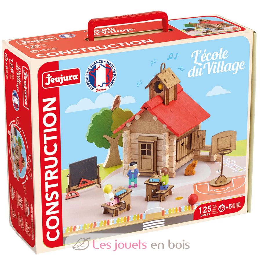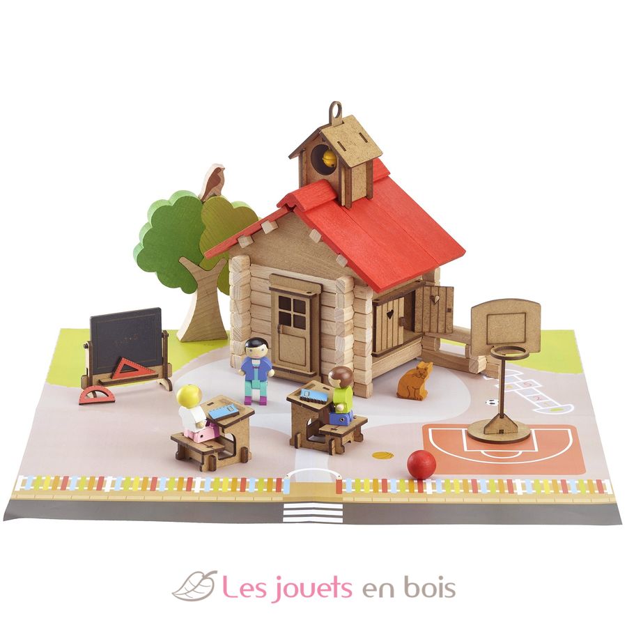 Una escuela de madera para construir y crear un mundo de juego donde podrás explorar la escuela y su patio de recreo.