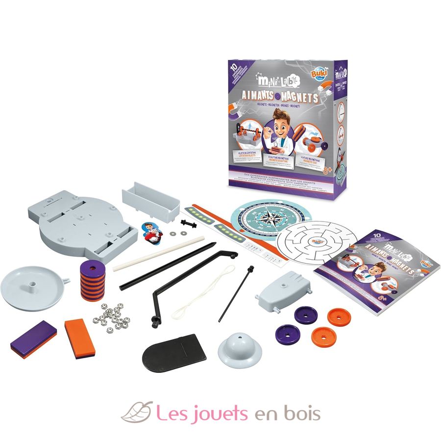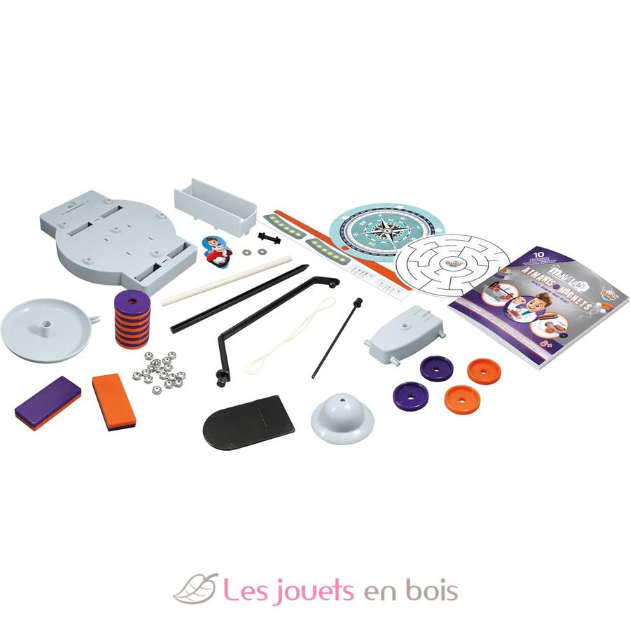 Este kit permite realizar 10 experimentos para descubrir las sorprendentes propiedades de los imanes: hacer levitar objetos, mover un pequeño coche sin tocarlo y fabricar una brújula.