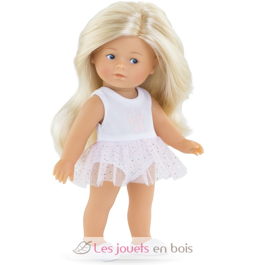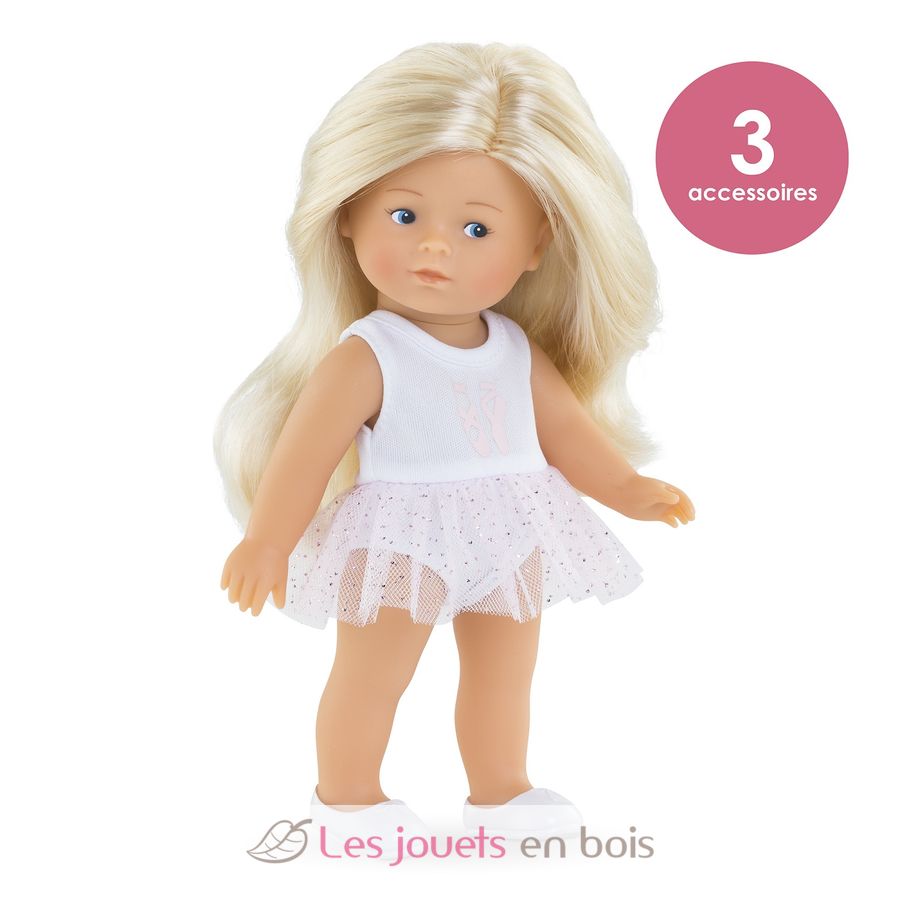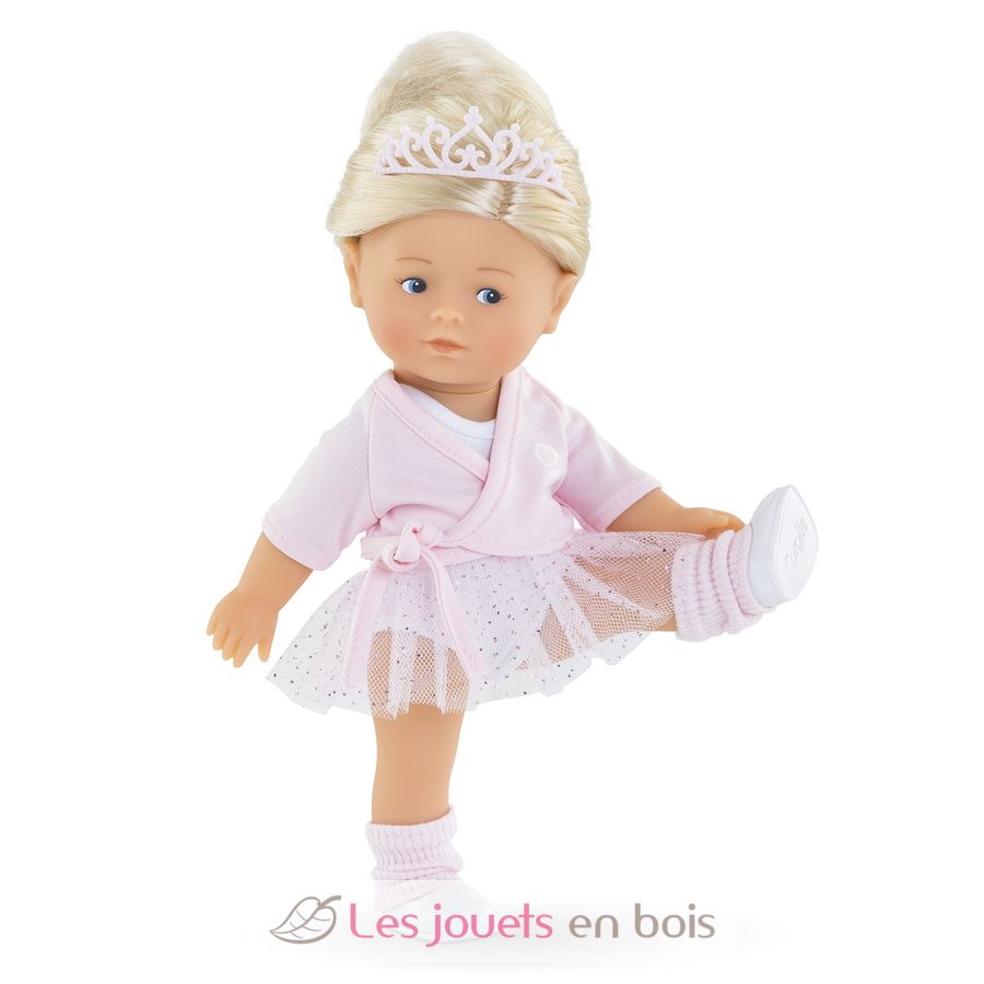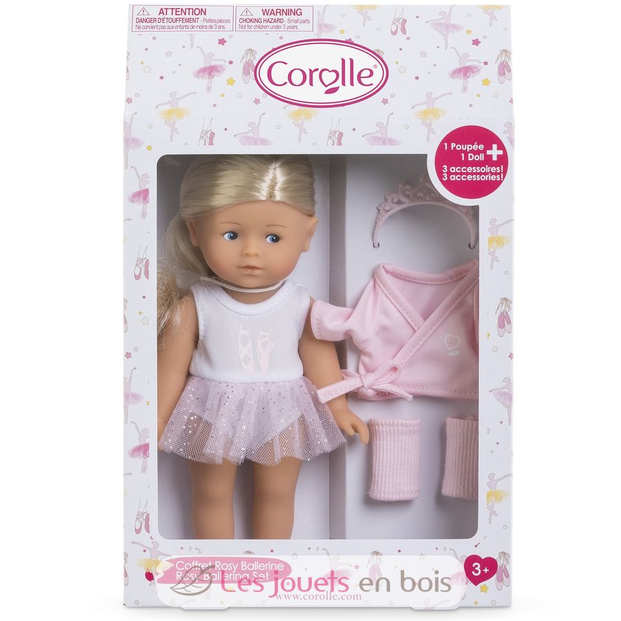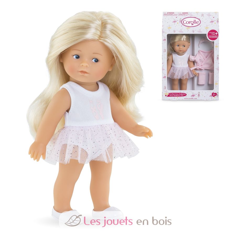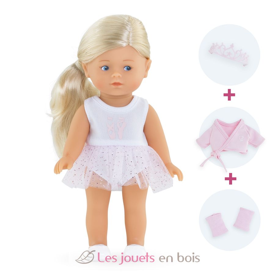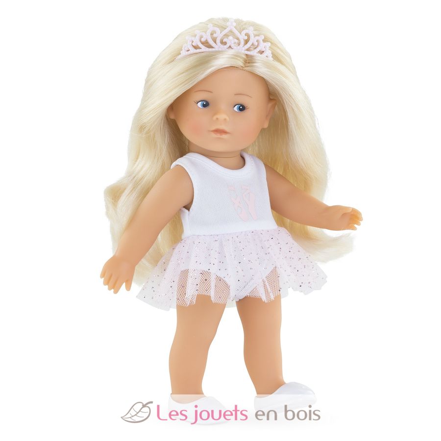 Un conjunto listo para regalar que consta de una pequeña muñeca de 20 cm vestida de bailarina, una tiara, un par de calentadores de piernas y un cárdigan cruzado.