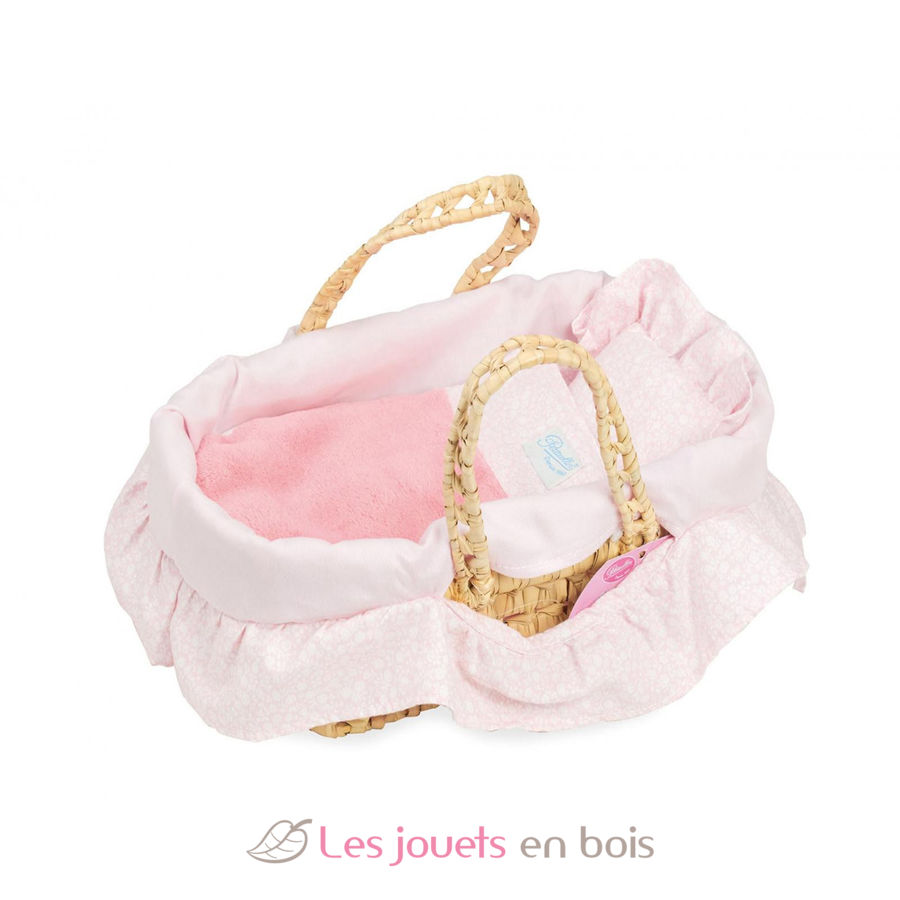 Precioso moisés para muñecas con ropa de cama. Este adorable moisés de palma natural, ribeteado con tela rosa, resulta de lo más práctico para que los muñecos de tu hijo viajen en él. Como cuna o moisés, los muñecos estarán cómodos y calentitos bajo la manta. Este moisés es adecuado para muñecas de hasta 28 cm aproximadamente.