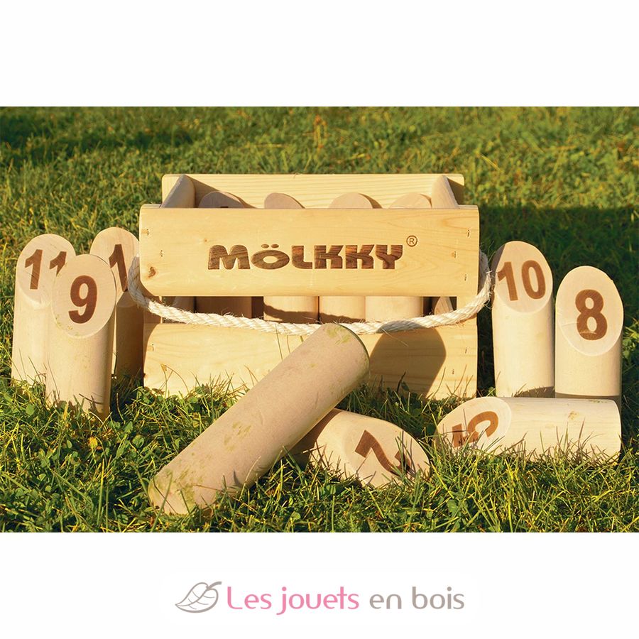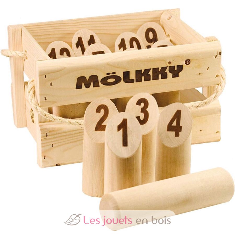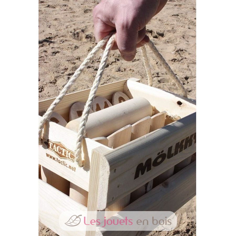 Simple y fácil de usar, la marca TACTIC Mölkky se ofrece en su versión de lujo. Los bolos se guardan y transportan en una caja de pino con asa de cuerda.
