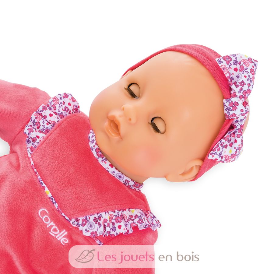 Su cuerpo flexible le permite adoptar las mismas posiciones que un bebé real y sentarse. Su cara, brazos y piernas están hechos de vinilo suave al tacto con el delicado aroma a vainilla, una característica distintiva de las muñecas Corolle. Con sus ojos soñolientos, cierra los ojos para dormir cuando lo recuestas boca arriba.