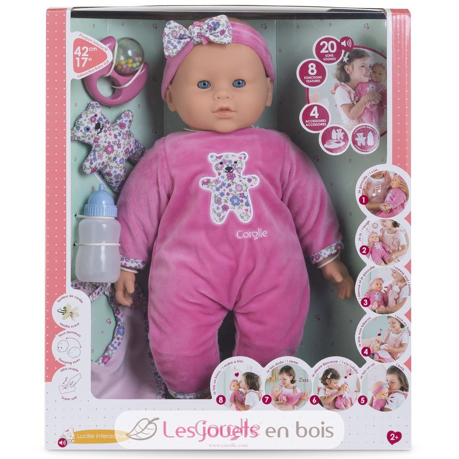 Lucille es una muñeca interactiva de 42 cm, que se entrega con su biberón, su babero, su peluche y su sonajero.