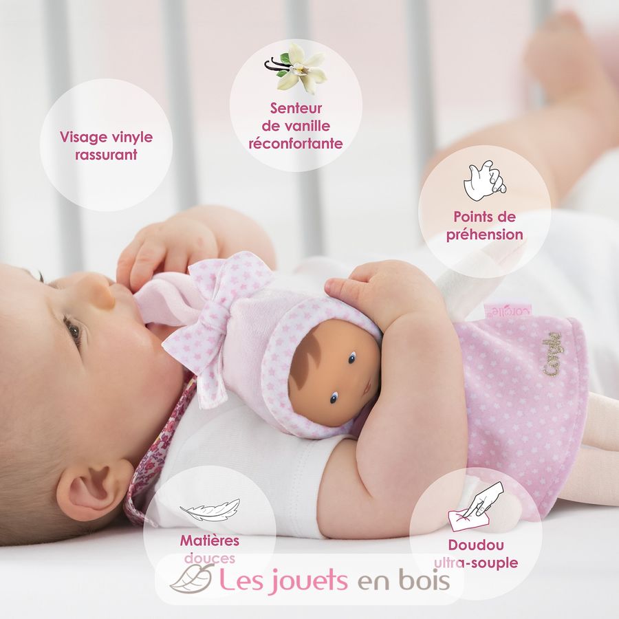 Una muñeca de 25 cm muy suave, fabricada por Corolle.