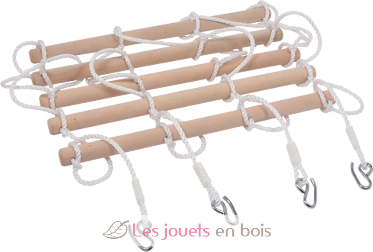 ¡Un reto para los pequeños artistas de la escalada! 5 barras de madera (4 x 68 cm) están seguramente unidas a 4 fuertes cuerdas. ¡Un buen ejercicio para aprender el control del cuerpo y para la fuerza! Con una altura de 1,95 metros, también puede utilizarse como escalera de cuerda para subir fácilmente a las alturas. Peso máximo 120 kg.