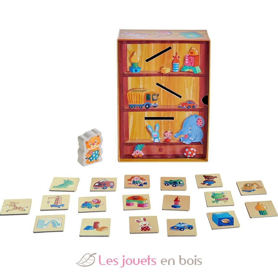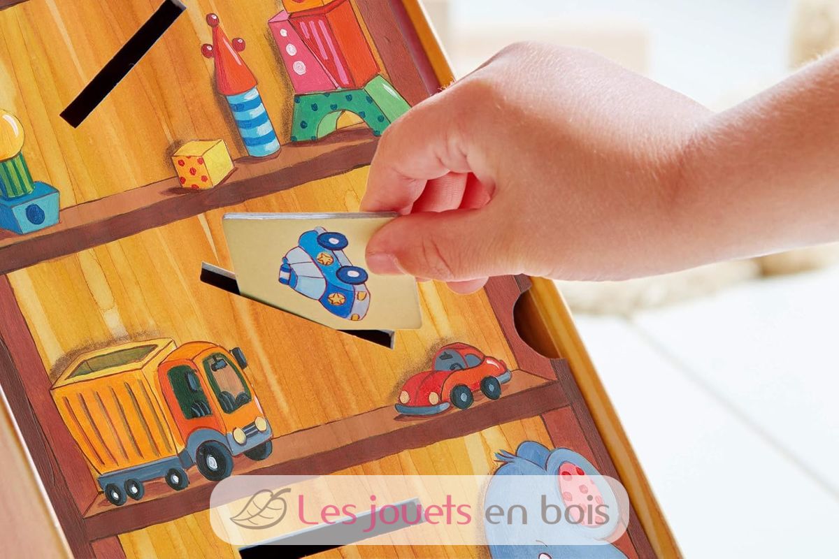 Contenido: 1 estante de juego (= tablero de juego en la caja), 1 gato Noisette, 18 placas de juguetes (6 x bloques de construcción, 6 x peluches, 6 x vehículos), 3 cajas de juguetes, 1 regla de juego.