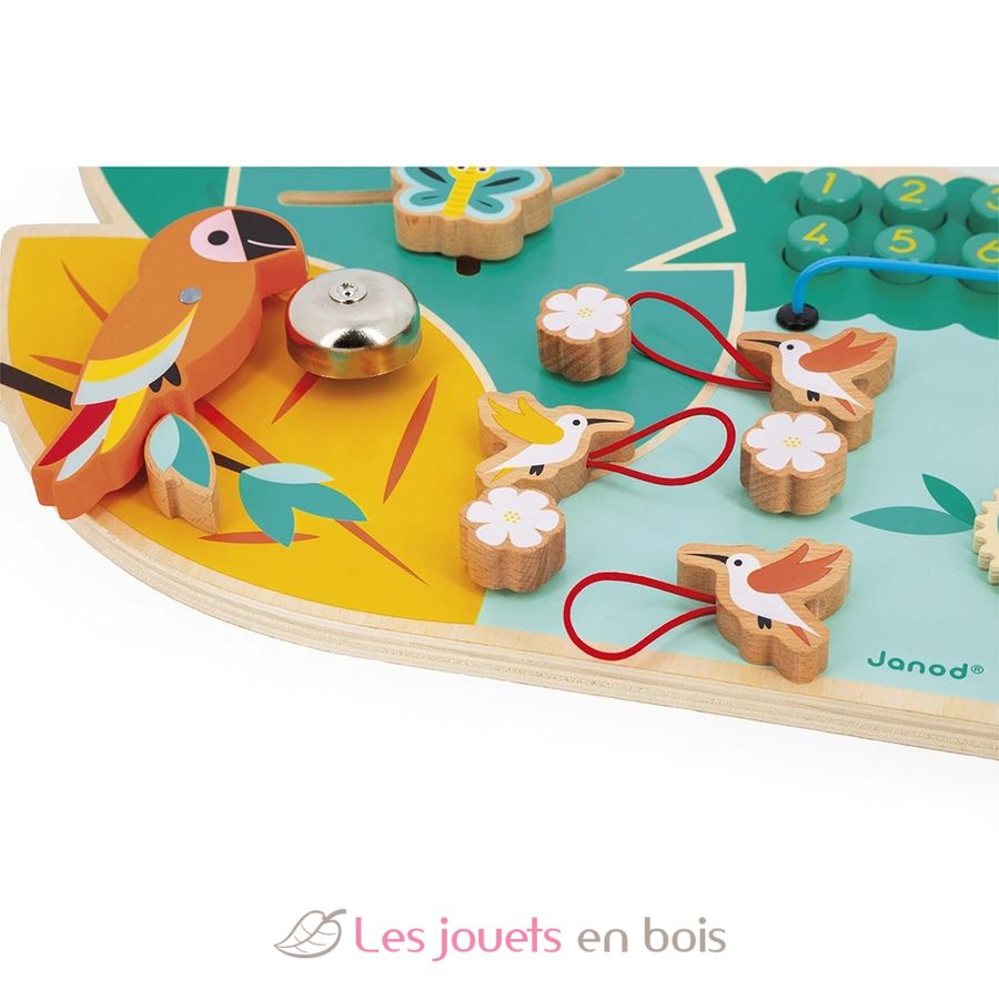 Muchos placeres táctiles y acústicos para desarrollar la motricidad fina del bebé. Y una serie de aberturas accesibles, perfectas para practicar el vestido. Es un juguete versátil, completo y perfecto para el juego independiente. El tablero de madera puede fijarse fácilmente a la pared. Quedará genial en cualquier habitación infantil, gracias a su estilo tropical y sus colores vivos.