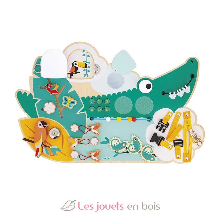 ¡Un tablero de actividades salido de la selva para la habitación del bebé! Ideal para entretener y estimular a los más pequeños a partir de los 18 meses, este tablero de actividades con forma de cocodrilo ofrece multitud de juegos con los que jugar. En total, más de 14 juegos de aprendizaje precoz se reparten en este tablero de actividades, para ayudar a desarrollar la motricidad y la destreza de los niños.